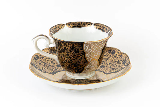 Teacup and plate with peach-patterned gold brocade (black)