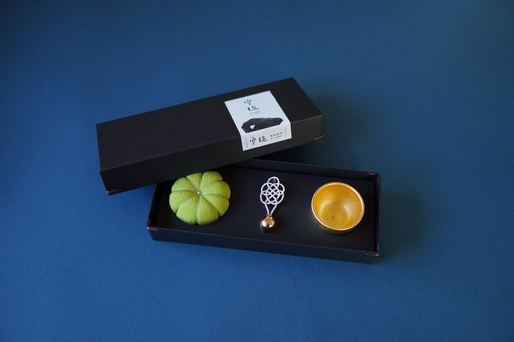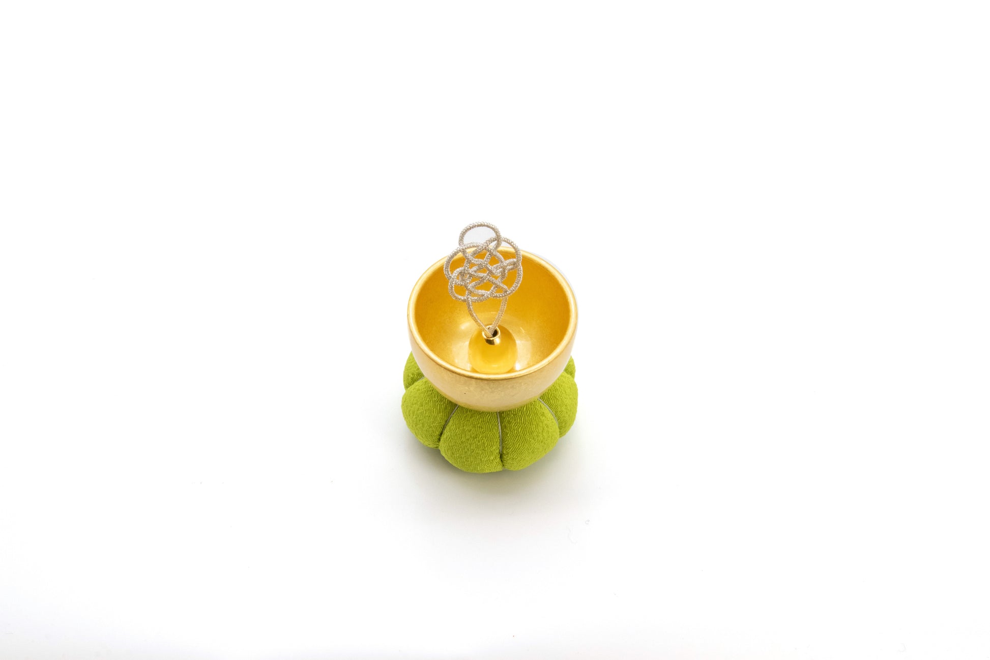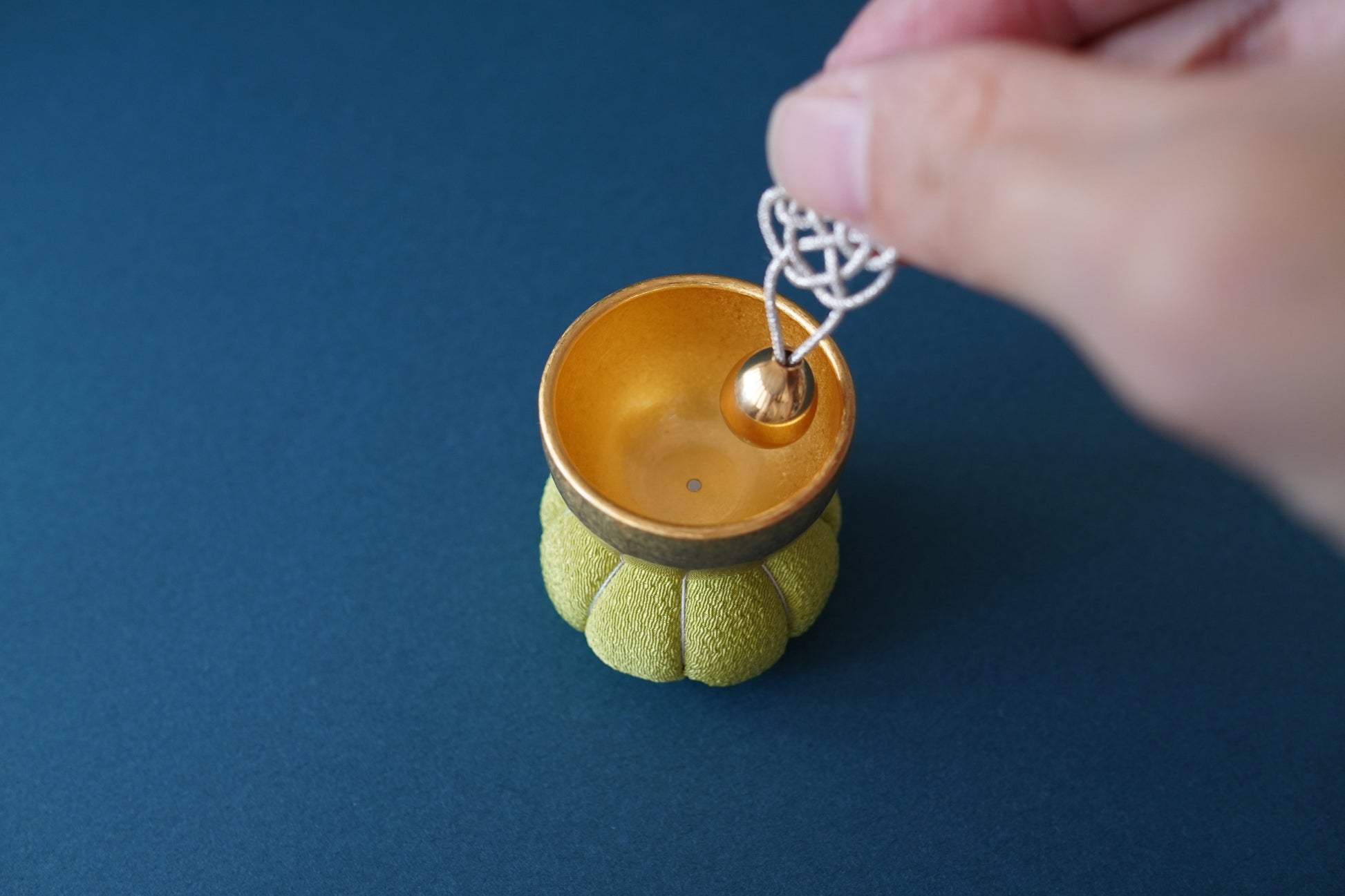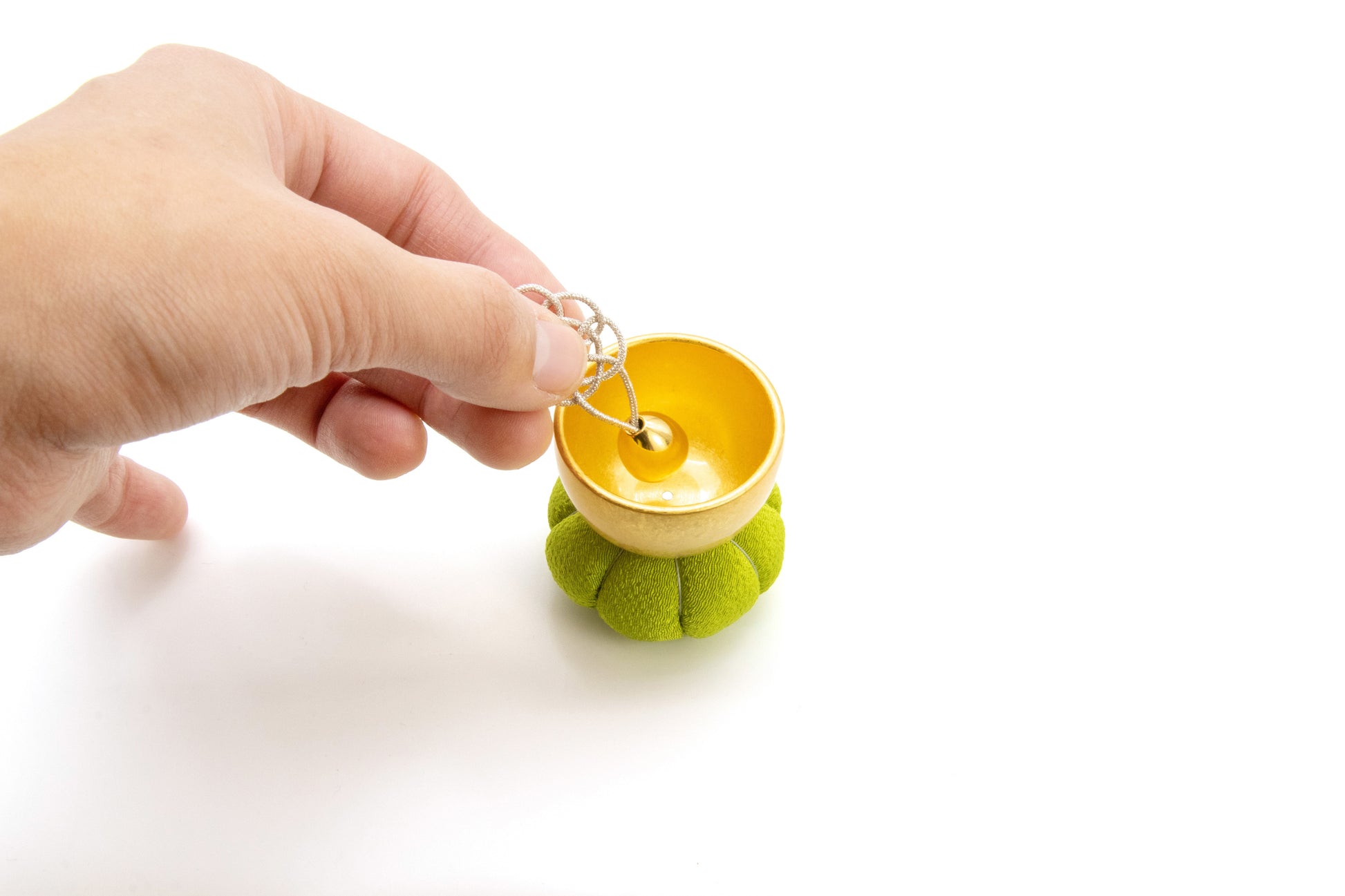 This small bell stands on a colorful zabuton cushion. It is struck with a cutely tied braided bell stick. Its bright, clear tone has a long lingering sound, and its charming presence will bring you a moment of refreshing relaxation every time you strike it.