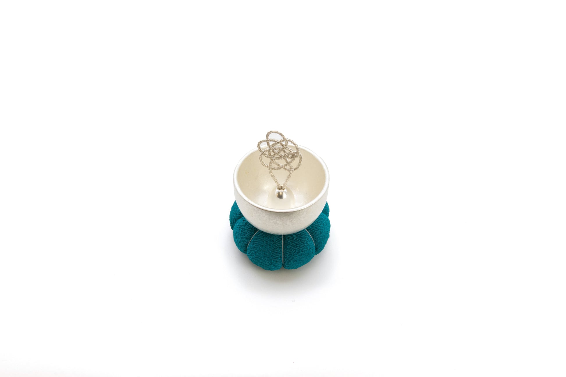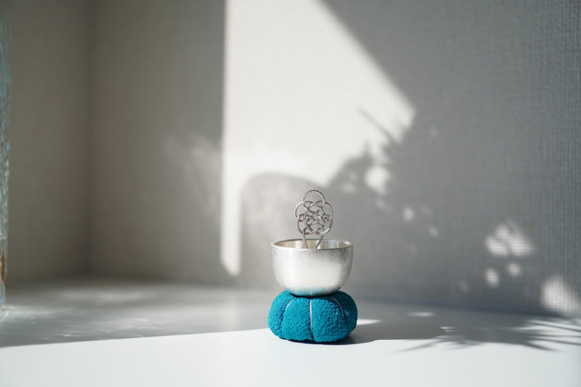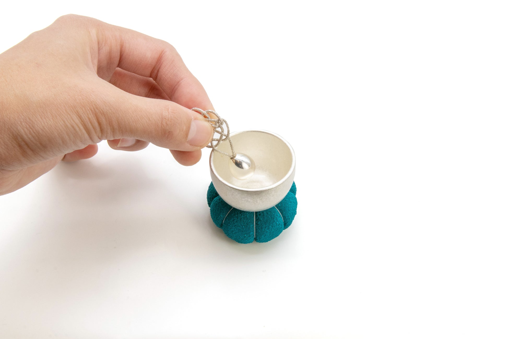 This small bell stands on a colorful zabuton cushion. It is struck with a cutely tied braided bell stick. Its bright, clear tone has a long lingering sound, and its charming presence will bring you a moment of refreshing healing every time you strike it.