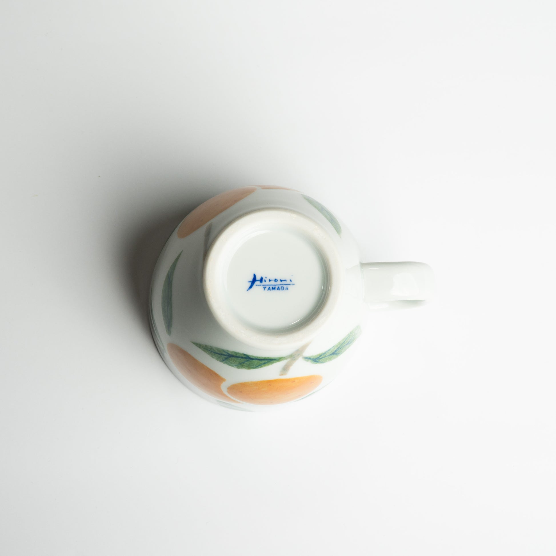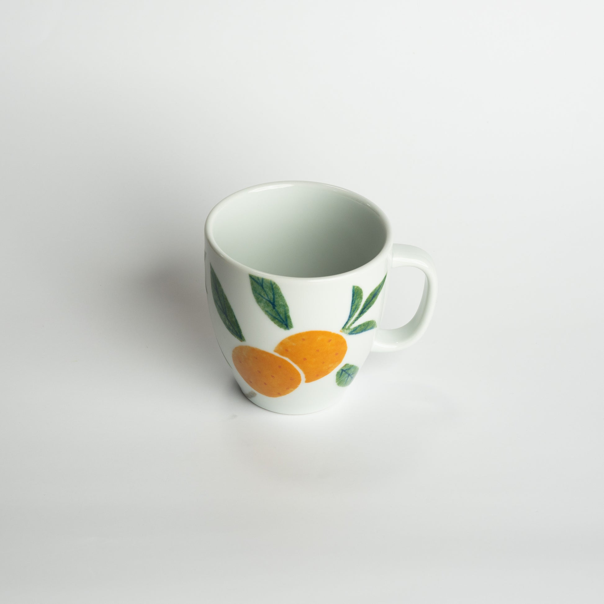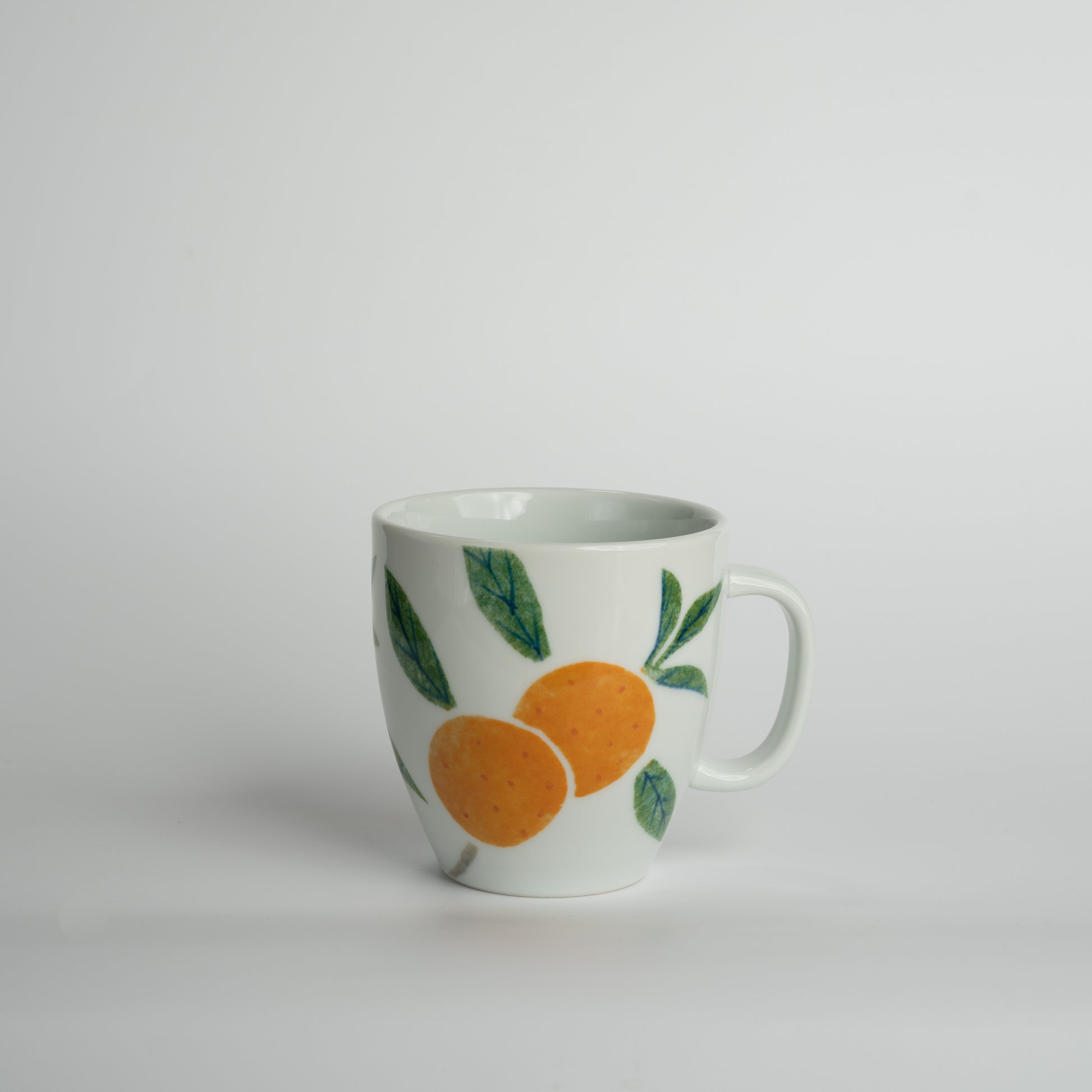 A mug with a design of Ehime's specialty, mandarin oranges. The painting is done using a brush, a technique that was developed by the company. This technique allows the creation of rich, vibrant colors.