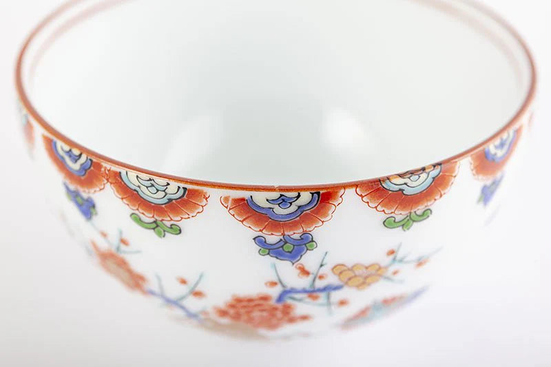 The technique of "iroe" (colored painting), which was developed about 30 years after the birth of Arita ware, brought color to the world of Arita ware, which had previously been dominated by white and indigo. One of the most representative patterns of this colored painting is the "plum and chrysanthemum design." While leaving space on the white base, the auspicious design of plum and chrysanthemum is expressed in vivid colors in an intricate manner. The model design was a symmetrical one, thought to have been produced for export, at a time when asymmetrical compositions were common. It is a pattern that still exudes freshness today.