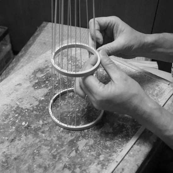 The wind chime stand is a traditional Suruga bamboo work, carefully crafted one by one by skilled artisans who cut thin, uniformly split bamboo into round pieces. The supple, smooth curves of bamboo bring a calming presence to everyday life and, over time, the color and luster improve, making it a beloved piece.