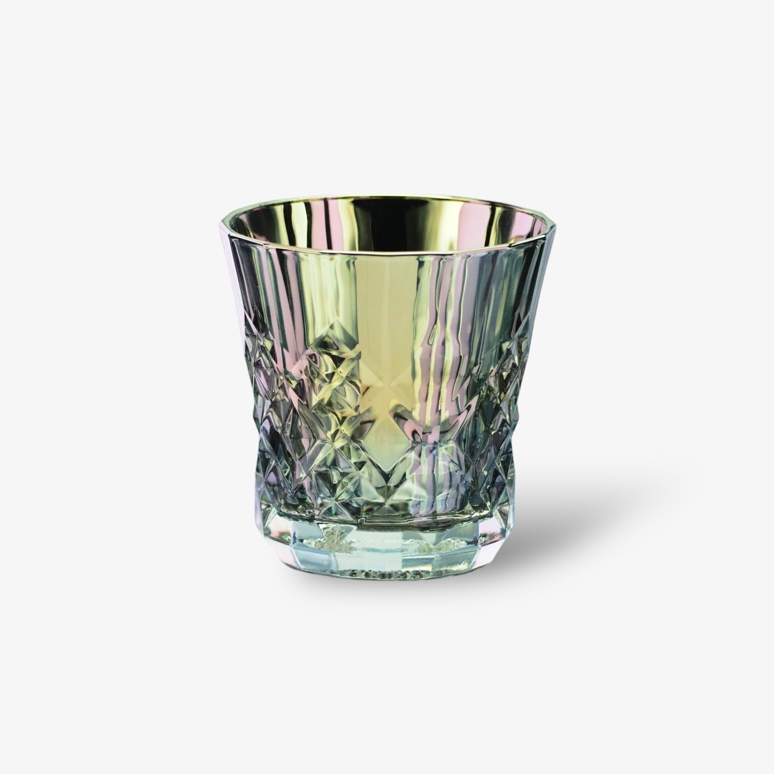 重厚なカットデザインが施されたロックグラス。光の表情が際立ちインテリアにもなる存在感。