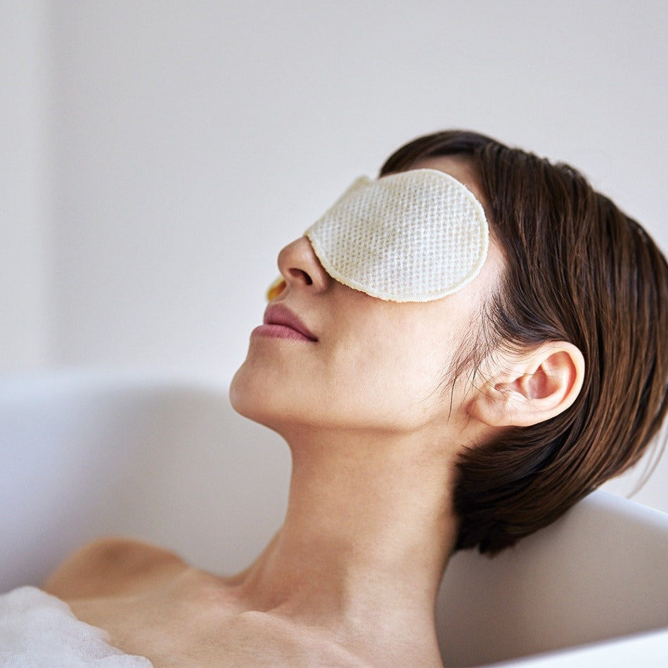 天然のスキンケア成分を含むワッフル生地を贅沢に使用した、お風呂で使うアイマスク。お湯によって溶け出す天然のスキンケア成分と、心地よい重さで疲れた目を癒します。くびれのある形状で目の周りにフィットします。