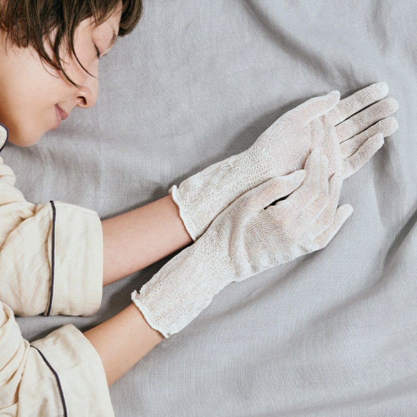 特殊な方法で繭から製糸された網状生糸を使用。空気層を含んだ構造とシャリ感が特徴です。就寝時など長時間使用することで、肌の潤いを保つ効果が期待できます。天然タンパク質「セリシン」を含んだ肌馴染みのよいグローブです。