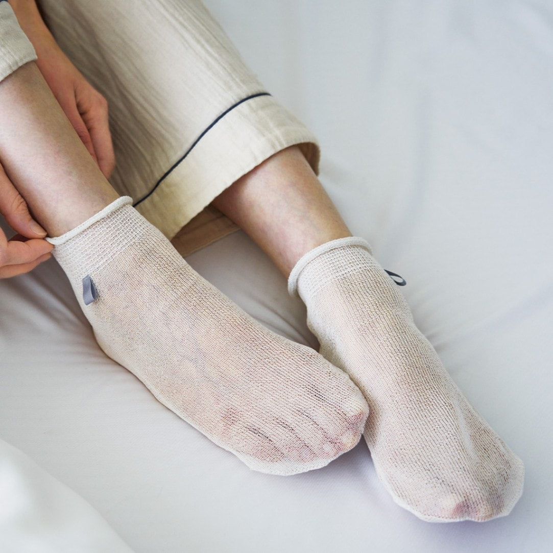 特殊な方法で繭から製糸された網状生糸を使用。空気層を含んだ構造とシャリ感が特徴です。就寝時など長時間使用することで、肌の潤いを保つ効果が期待できます。天然タンパク質「セリシン」を含んだ肌馴染みのよいソックスです。