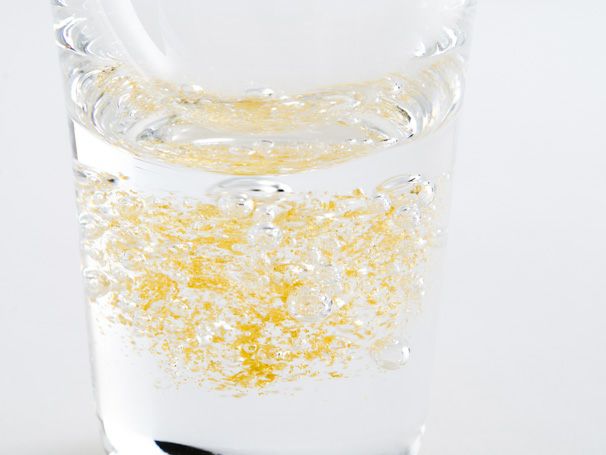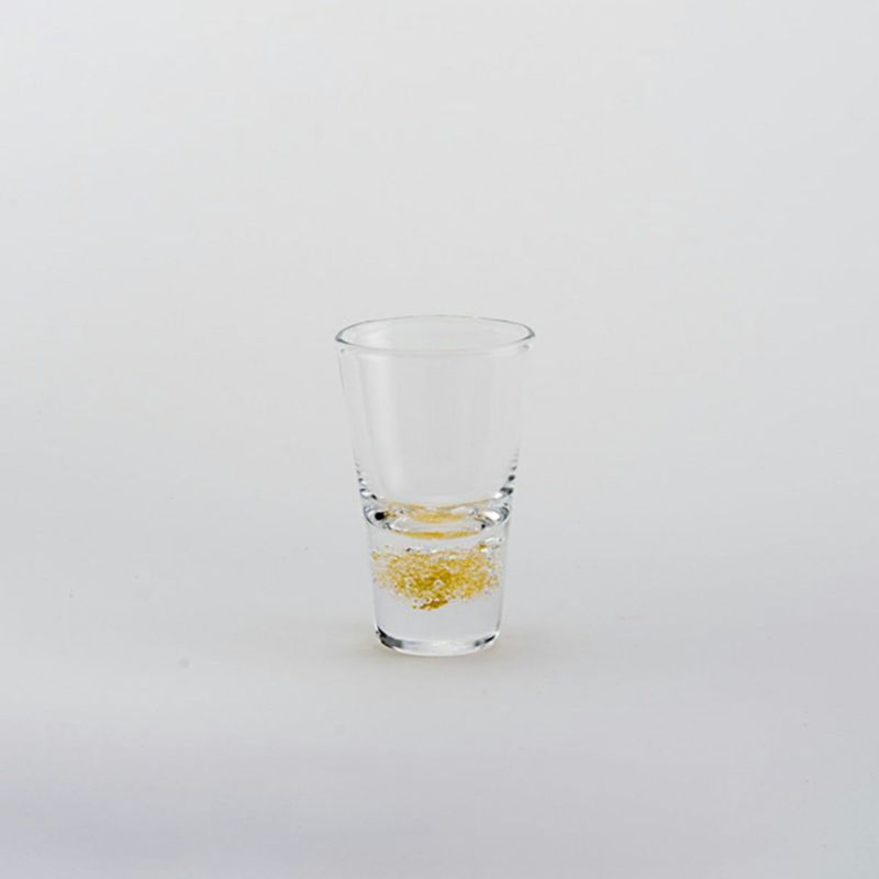 透き通るようなガラスの塊の中、底部分に一緒に封じ込められた泡(バブル)と金箔が目を惹く、美しいデザイン。泡と金箔の隙間に光が入ることでいっそう美しく輝くグラスは、飾っておくだけでも素敵ですが、お飲み物を注ぐとまた異なった印象になり、金箔がさらに映えます。 ひとくち分の小グラスはショットグラスとしてはもちろん、ちょっとしたおつまみを盛り付ける器としてお使いいただくのも素敵です。