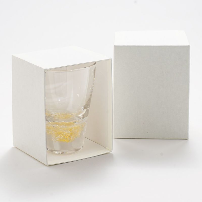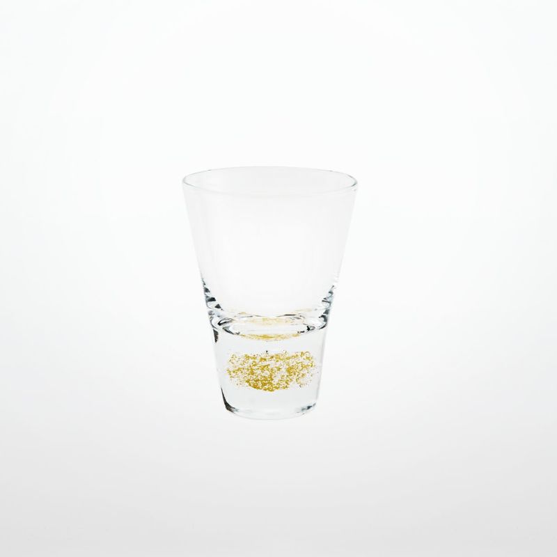 透き通るようなガラスの塊の中、底部分に一緒に封じ込められた泡(バブル)と金箔が目を惹く、美しいデザインのグラスです。