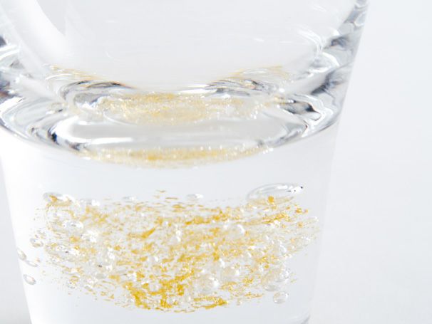 泡と金箔の隙間に光が入ることでいっそう美しく輝くグラスは、飾っておいても素敵ですが、お飲み物を注ぐとまた異なった印象になり、金箔がさらに映えます。泡や金箔の入り方が一点一点異なるのも、手吹きでつくる職人の手仕事ならでは。