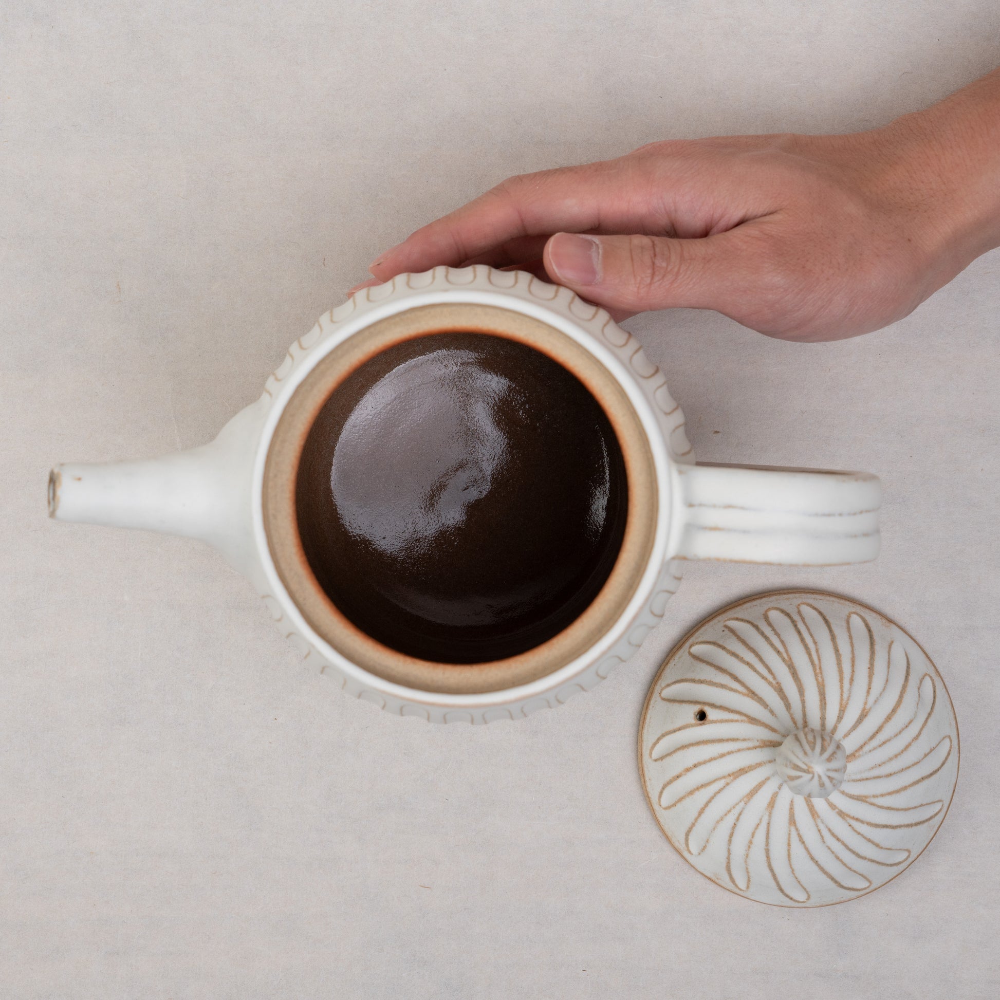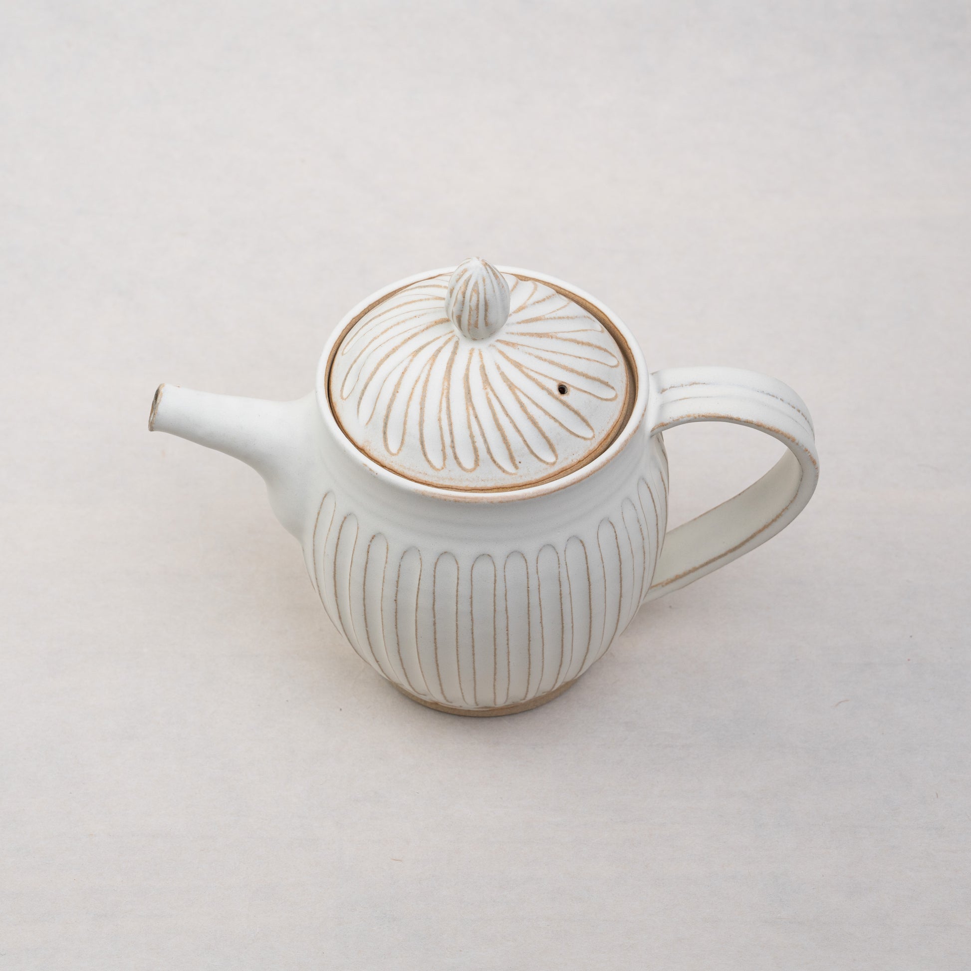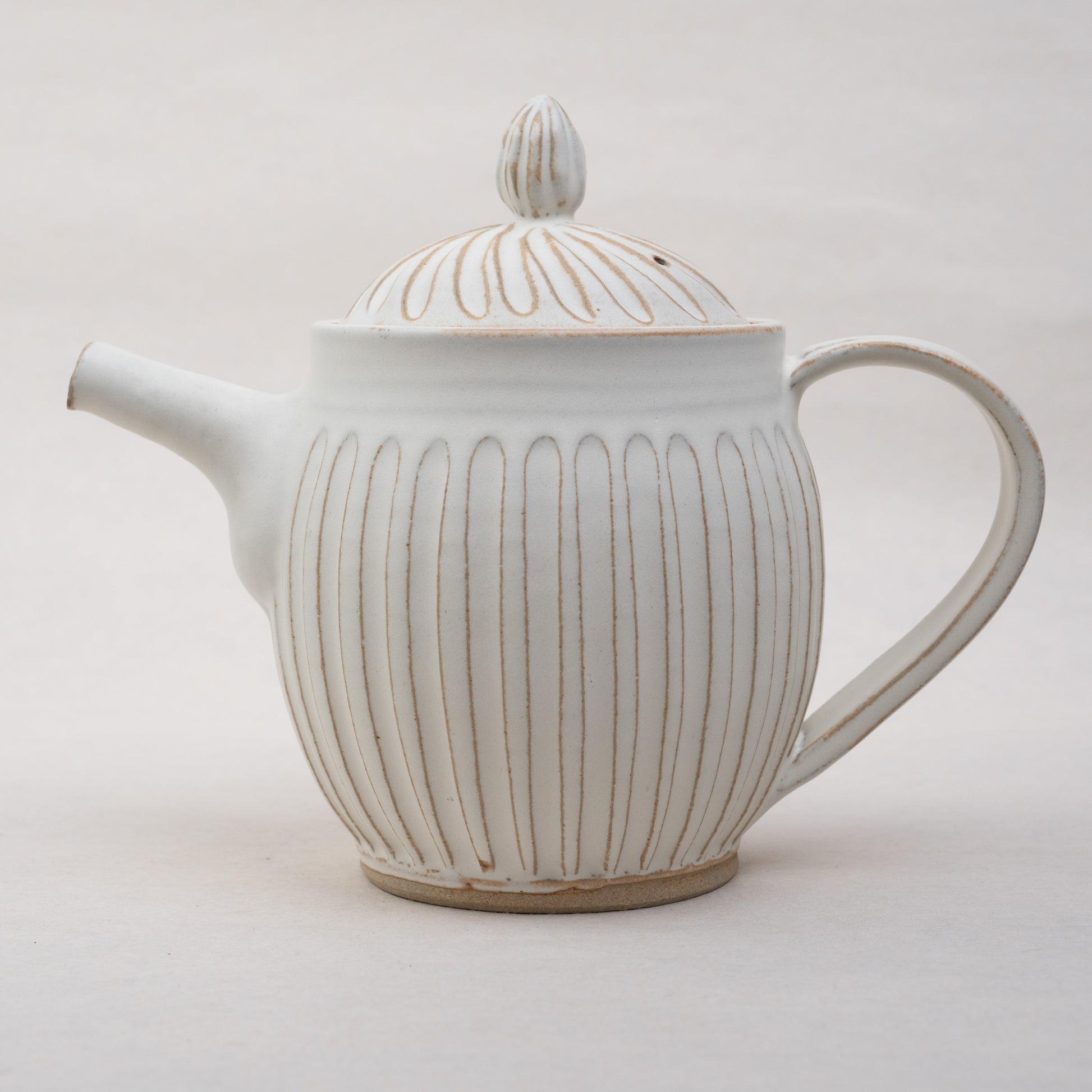 マットな質感が特徴的な、鎬の入った白釉のティーポットです。蓋のつまみ部分は、種をイメージして作られています。