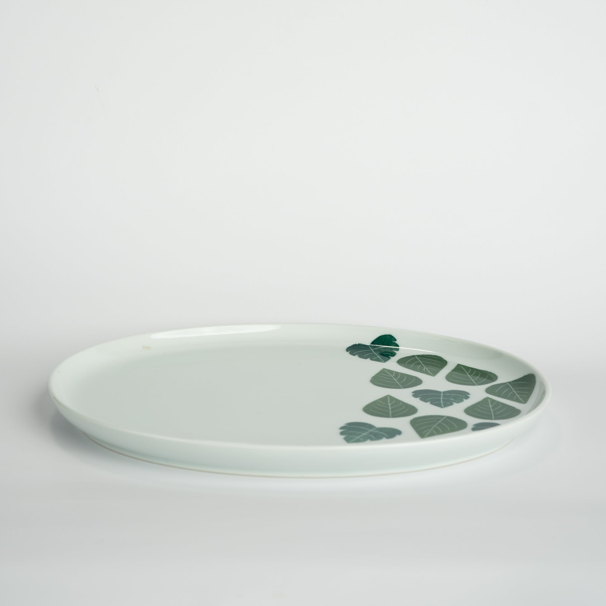 グリーンリーフが描かれた色々な用途に使えるオーバルディッシュ。独自で開発した絵付けはブラシを用いて表現する「ブラッシング技法」。この技法で豊かな極彩色を表現している