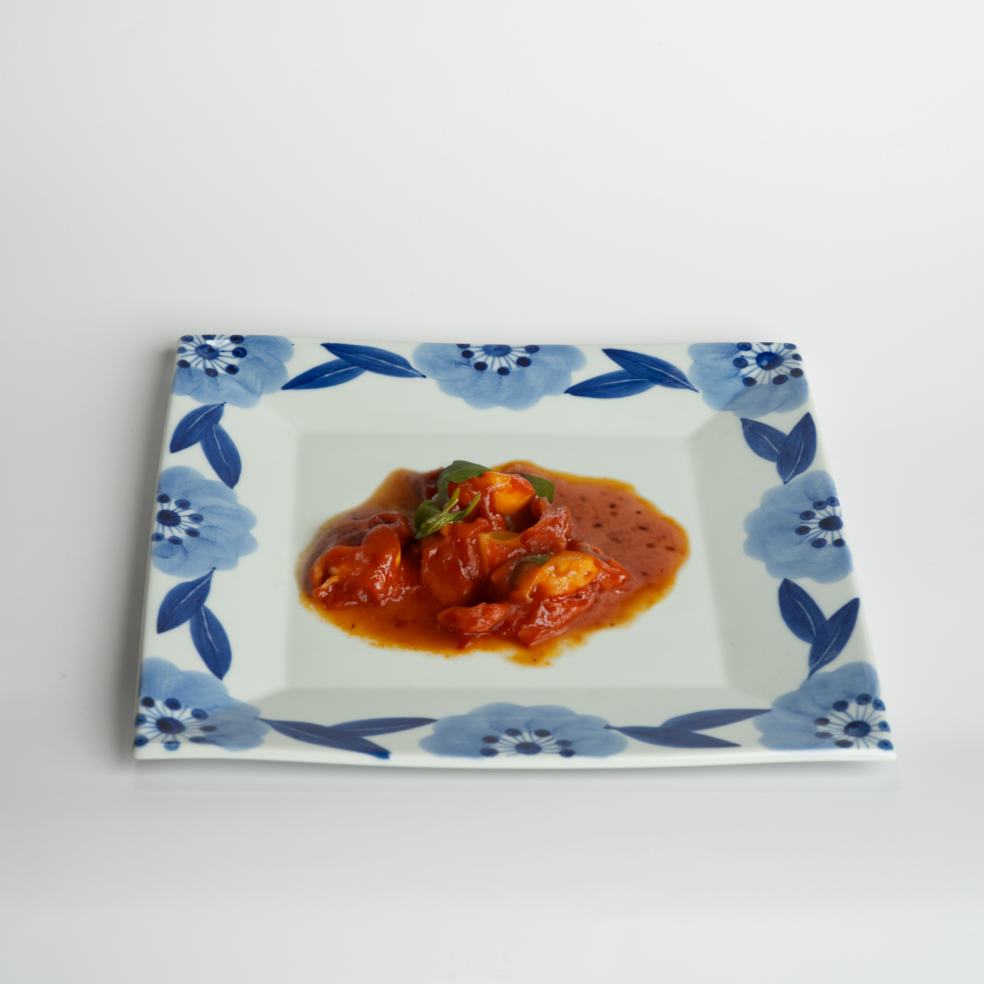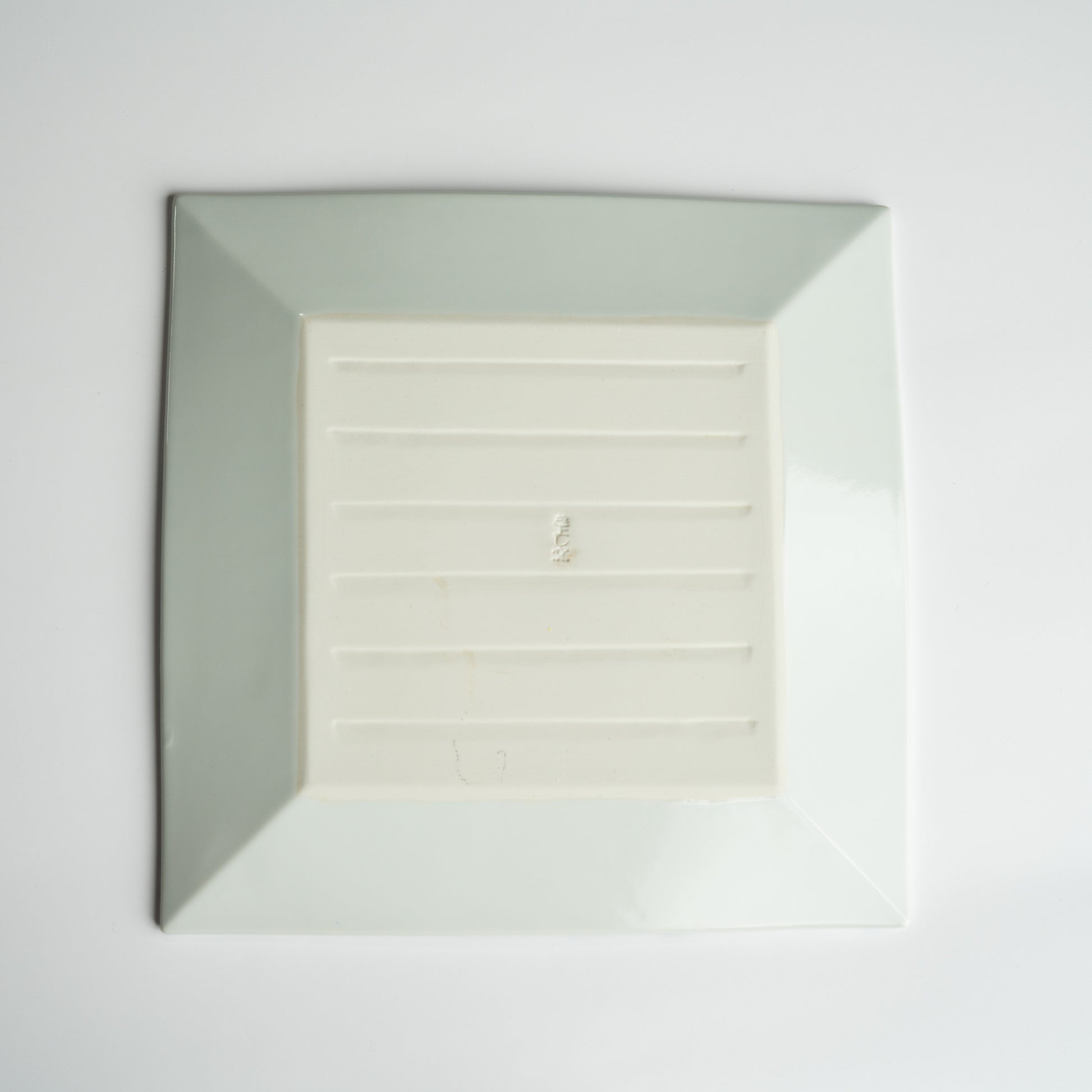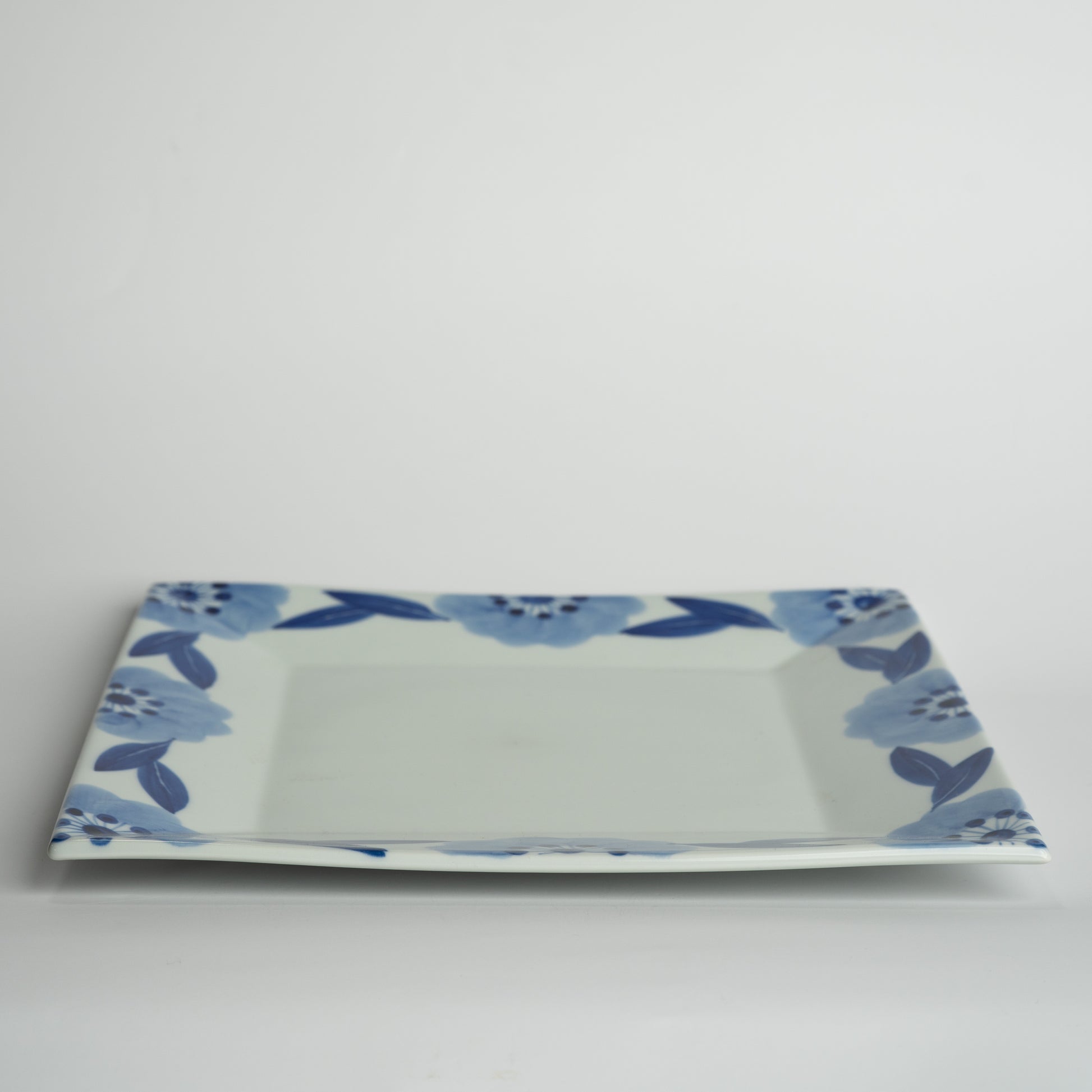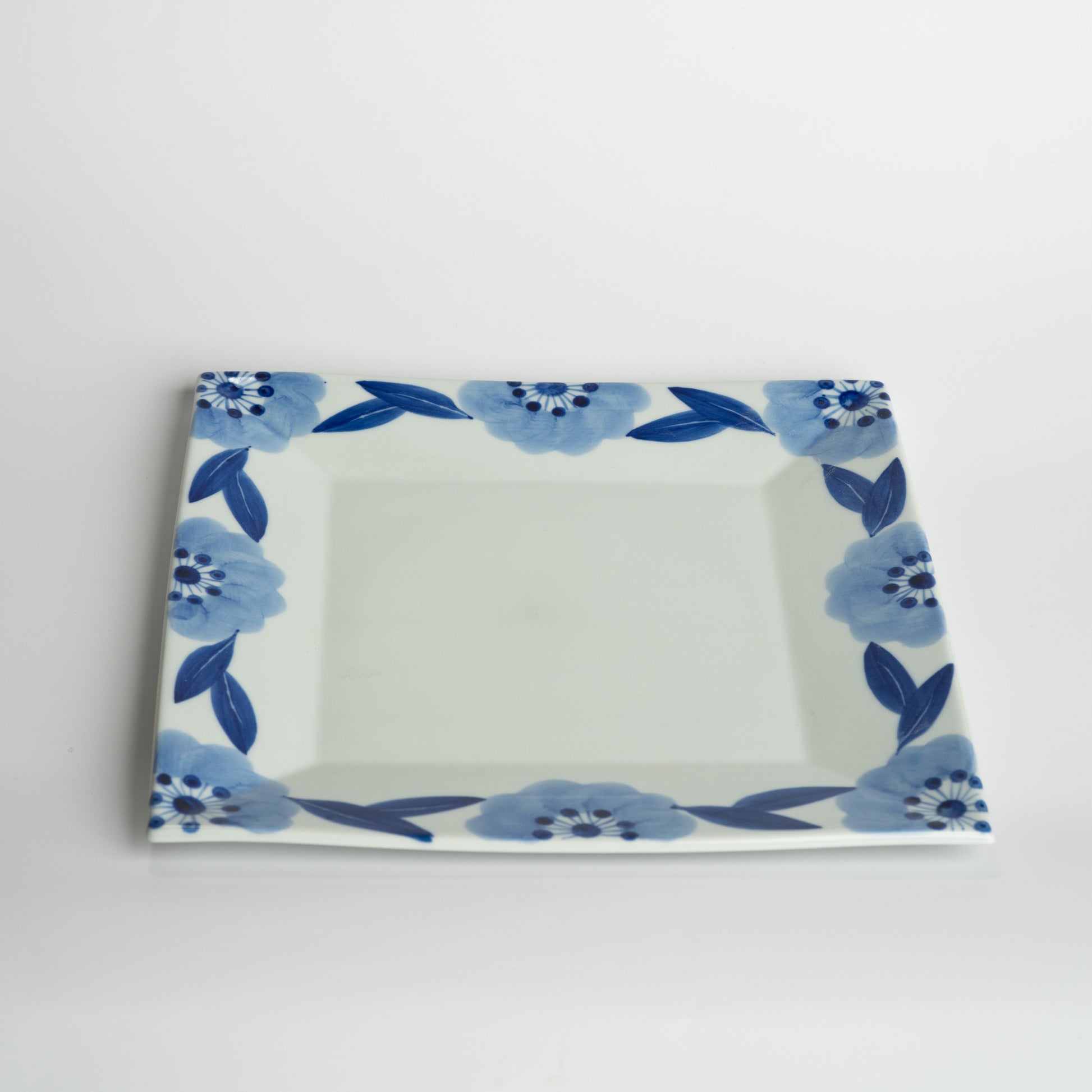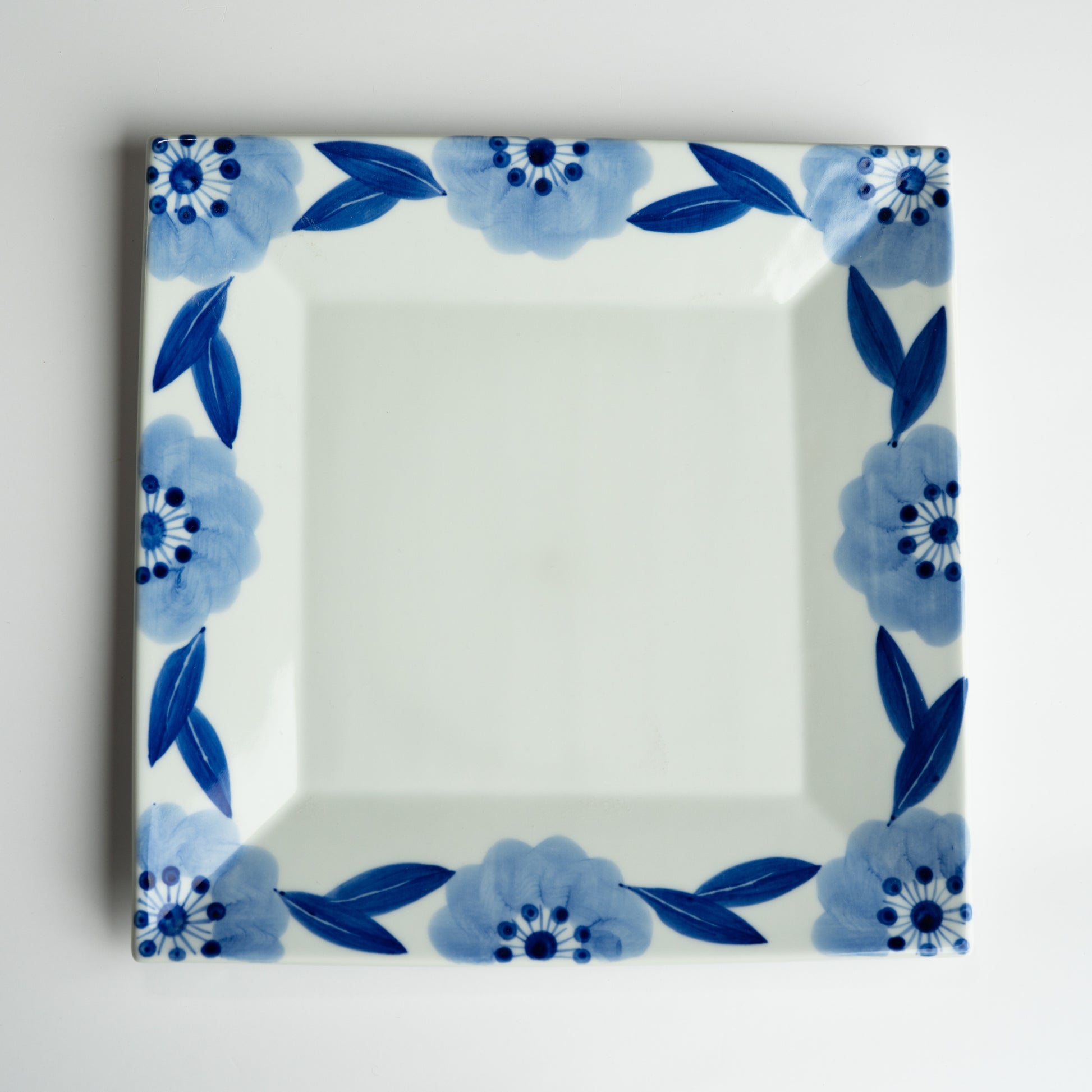 砥部焼の伝統的な色合いで花が描かれた、和洋共に使える万能型のスクエアプレート。独自で開発した絵付けはブラシを用いて表現する「ブラッシング技法」。