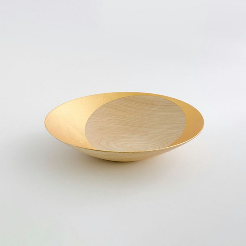 箔ならではのシワや艶といった表情や質感、陰影など、その美しさや魅力を存分に楽しめる器は、木のあたたかな風合いと美しい木目を活かしながら、内側と外側で異なる2色の箔を施すことで、ナチュラルな木肌と極薄の金属である箔の対照的な素材のコントラストや、唯一無二の純金プラチナ箔「永遠色」「久遠色」をひとつの器で楽しめるようなデザインになっています。
