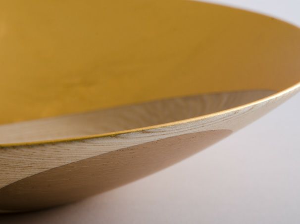 山中漆器の高度なろくろ技術で挽かれた、薄く軽い栓(せん)の木の器に、2色の純金プラチナ箔を大胆に配しました。内側はドットを抜き、逆に外側にはドットの箔を置いた、シンプルながら斬新なデザインのボウルです。