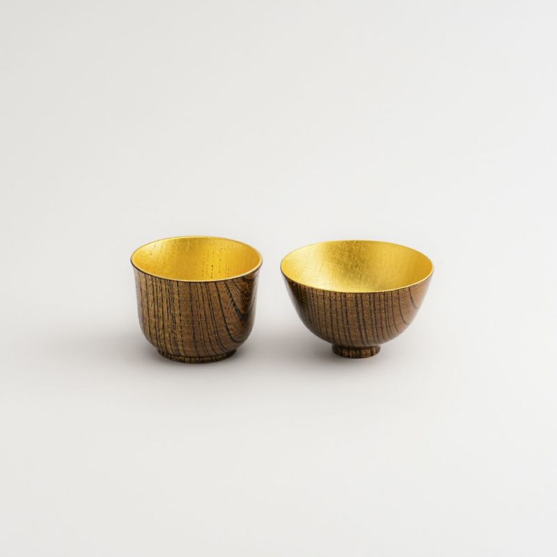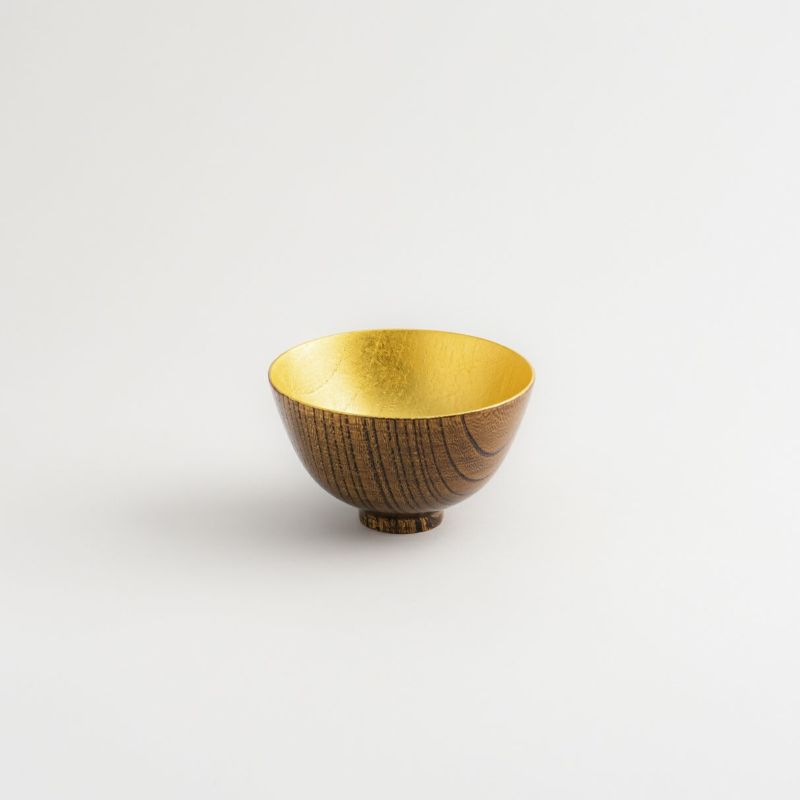 拭き漆仕上げのぐい呑みの内側を、シンプルに金箔で覆いました。欅(けやき)の木目と、極薄の金属である箔。素材のコントラストも魅力のひとつ。 明るく華やかな輝きが、お酒をよりいっそう美味しく感じさせてくれます。