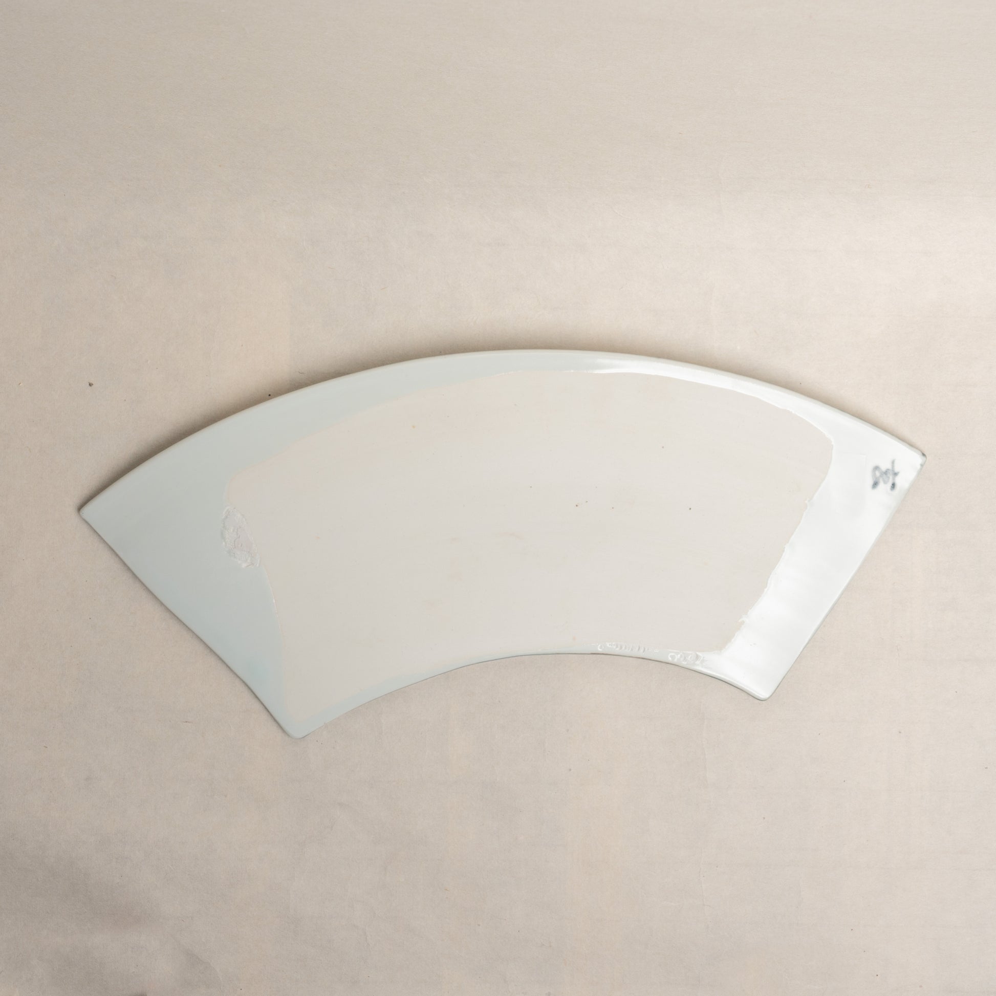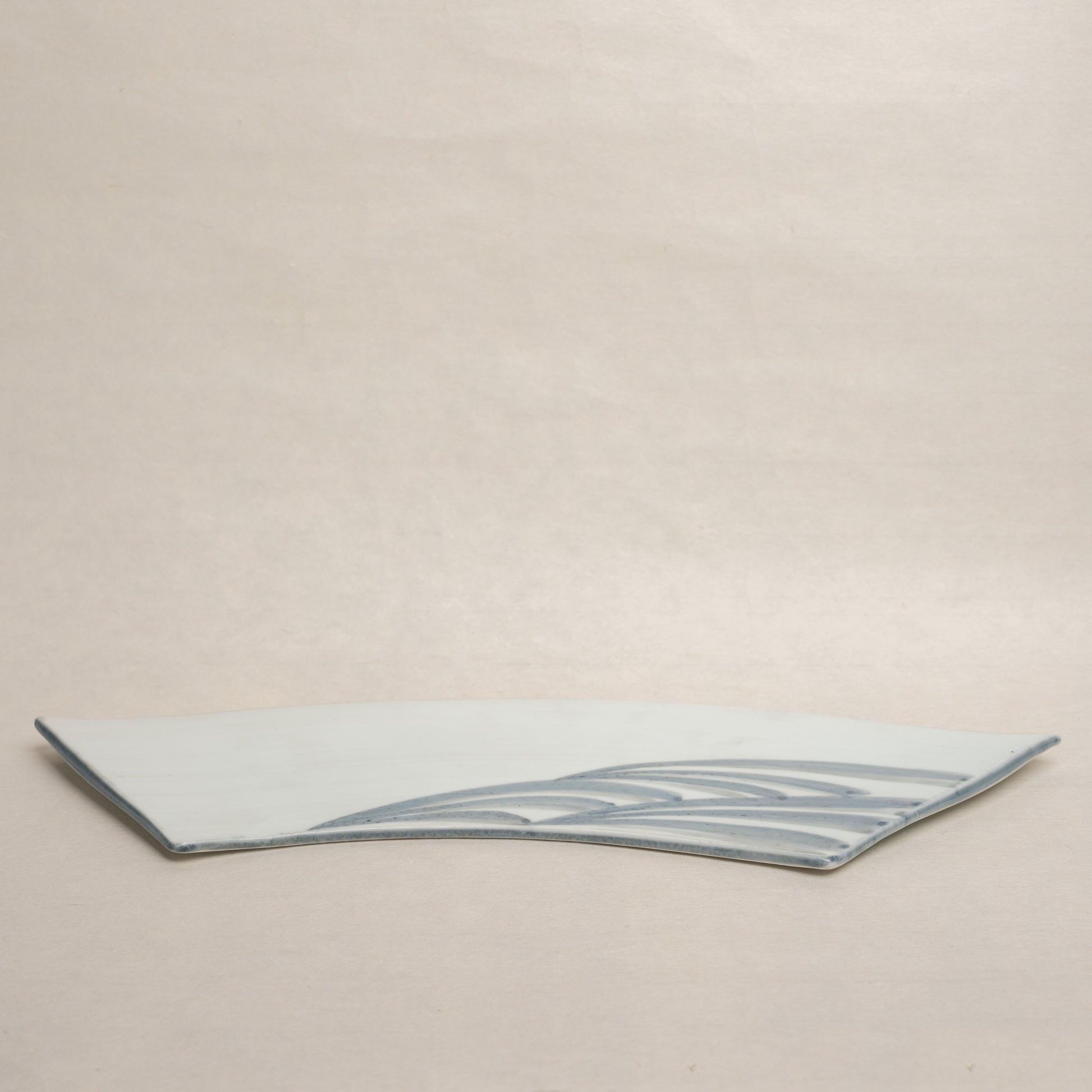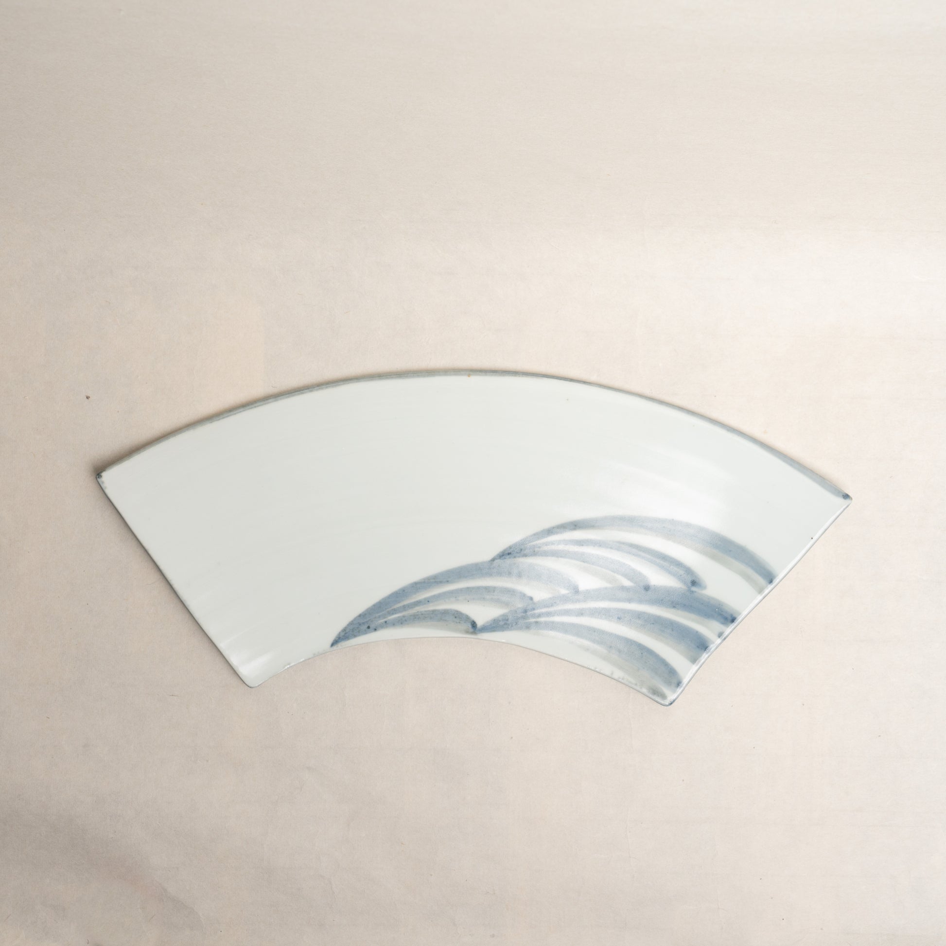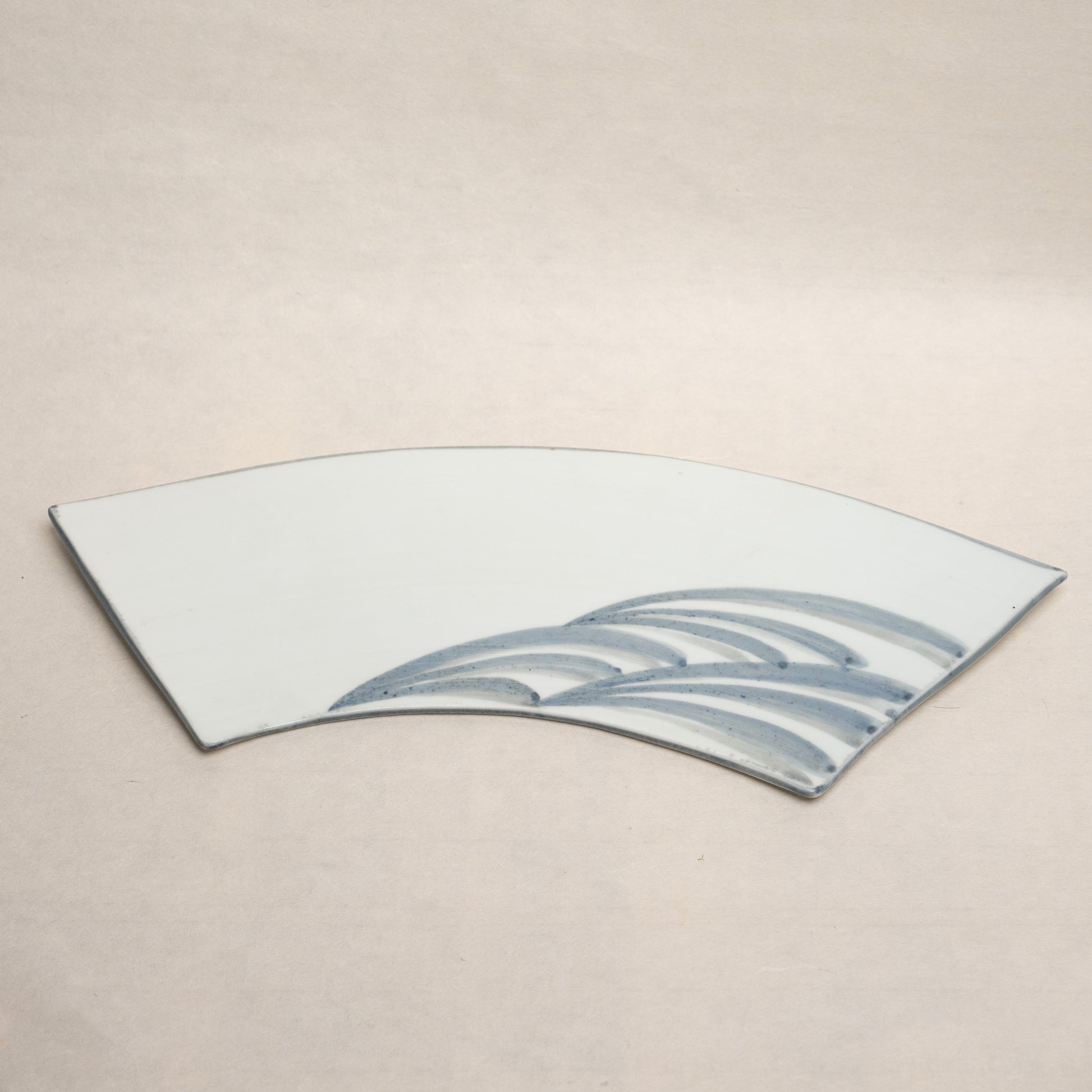 ロクロ成型した素地を3等分にカットしたものです。 その証に、同心円の手跡が残っています。 柄は得意の瀬戸波文で、余白を活かして食材が生きるようシンプルに仕上げています。 裏面には釉つきがあり、いかにも手作り感が溢れています。 和菓子盆や寿司盆にも活躍しますし、また皿立てとしてインテリアでも使えます。 洋間でも粋な演出ができる優れものです。