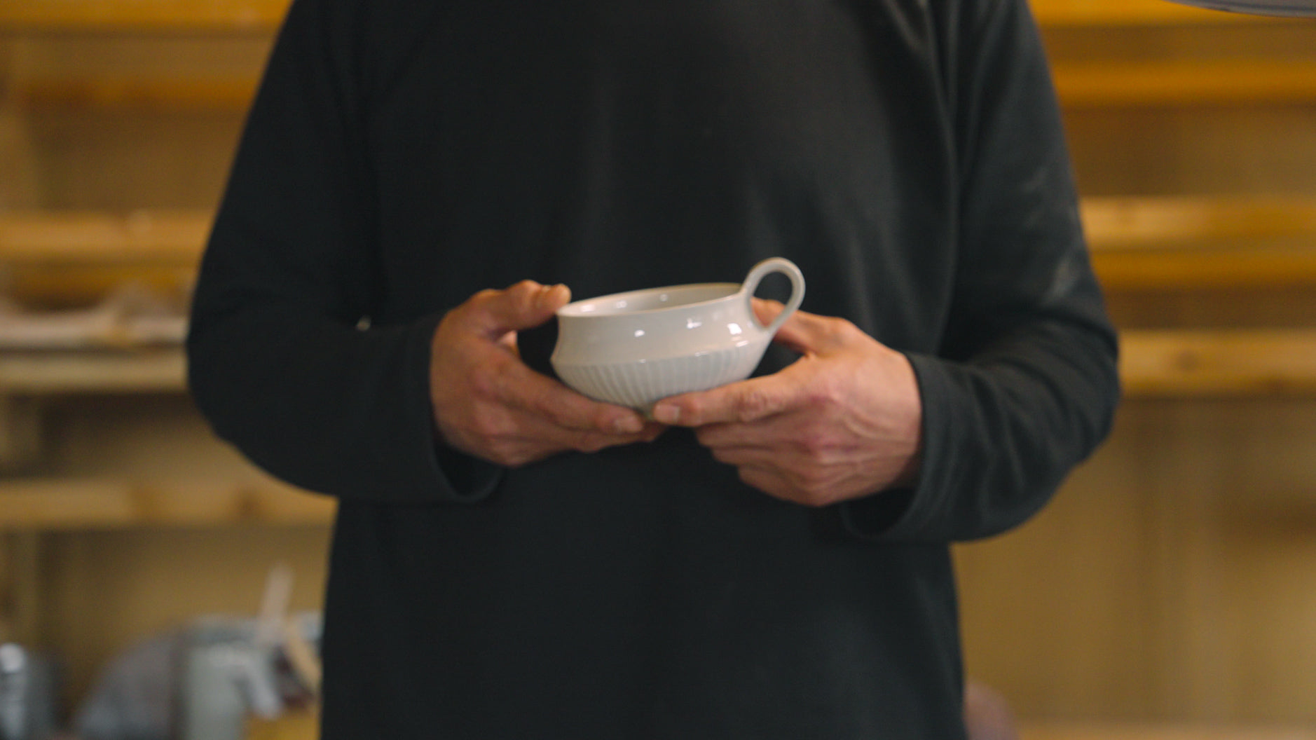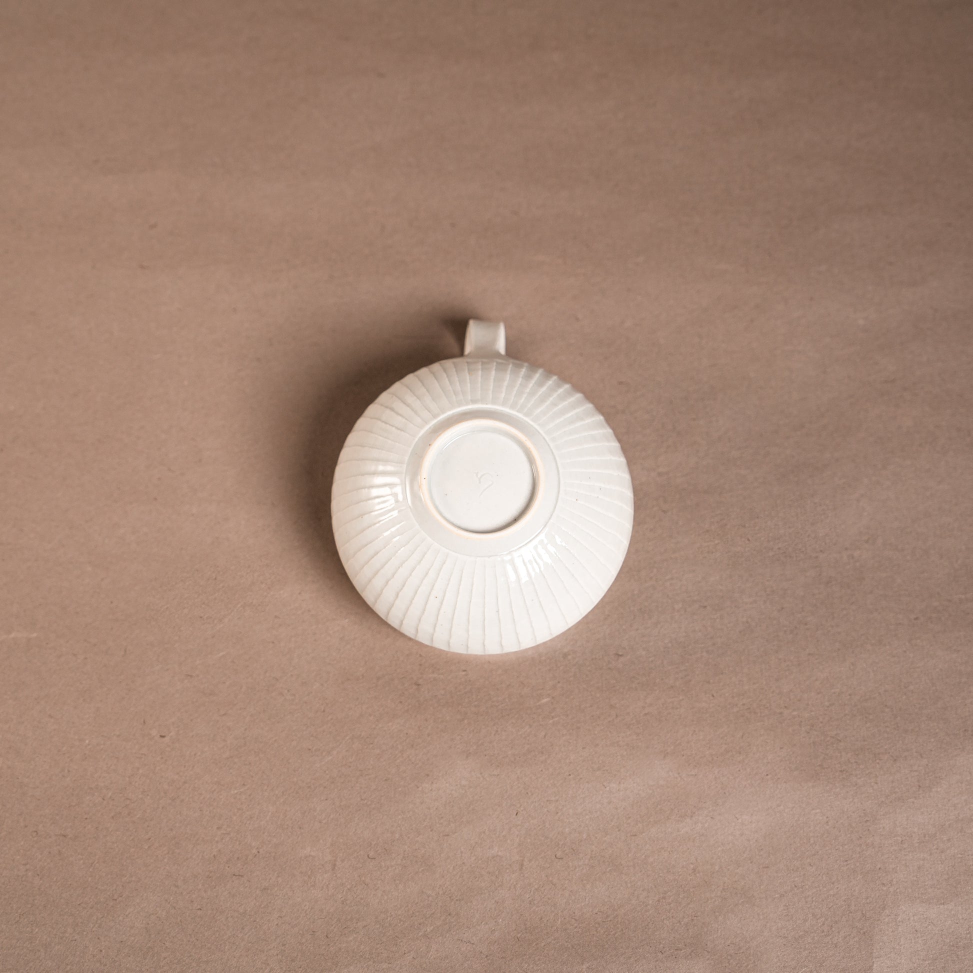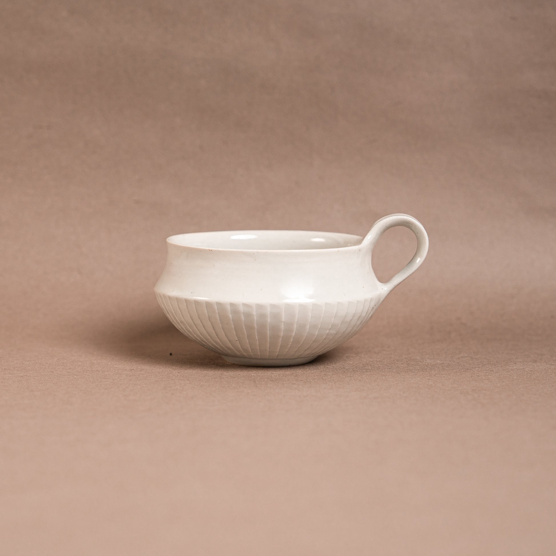 下半分だけ鎬(しのぎ)が彫られた、白磁のスープマグです。 口縁の下が少しくぼんでいるのは、丹念に削りを入れ、口当たりを良くするためのこだわりです。 削りによって造形の美しさが増します。容量は八分目で約200ccです。