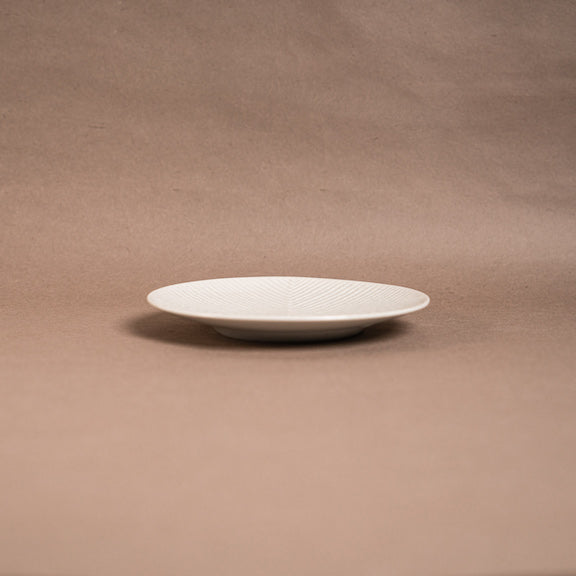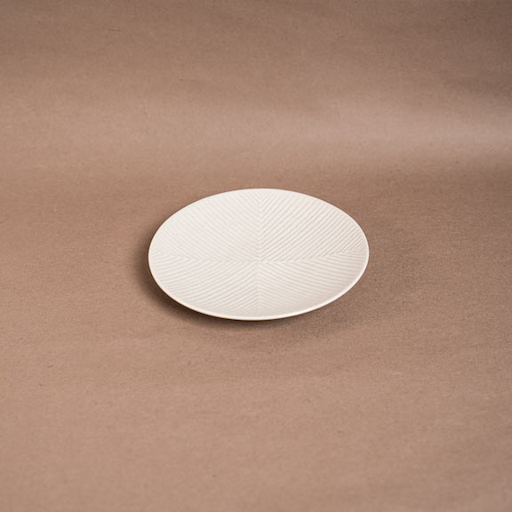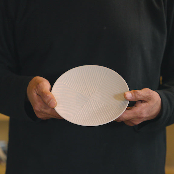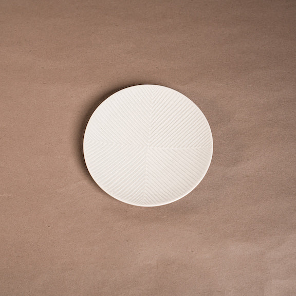 見込みを四分割して、違う方向から丹念に一本ずつ線を入れる鎬(しのぎ)の技法で作られている白磁のお皿です。 上品な艶感で食卓に馴染み、和洋問わず料理を引き立てます。 デザートや取り皿としておすすめのお皿です。