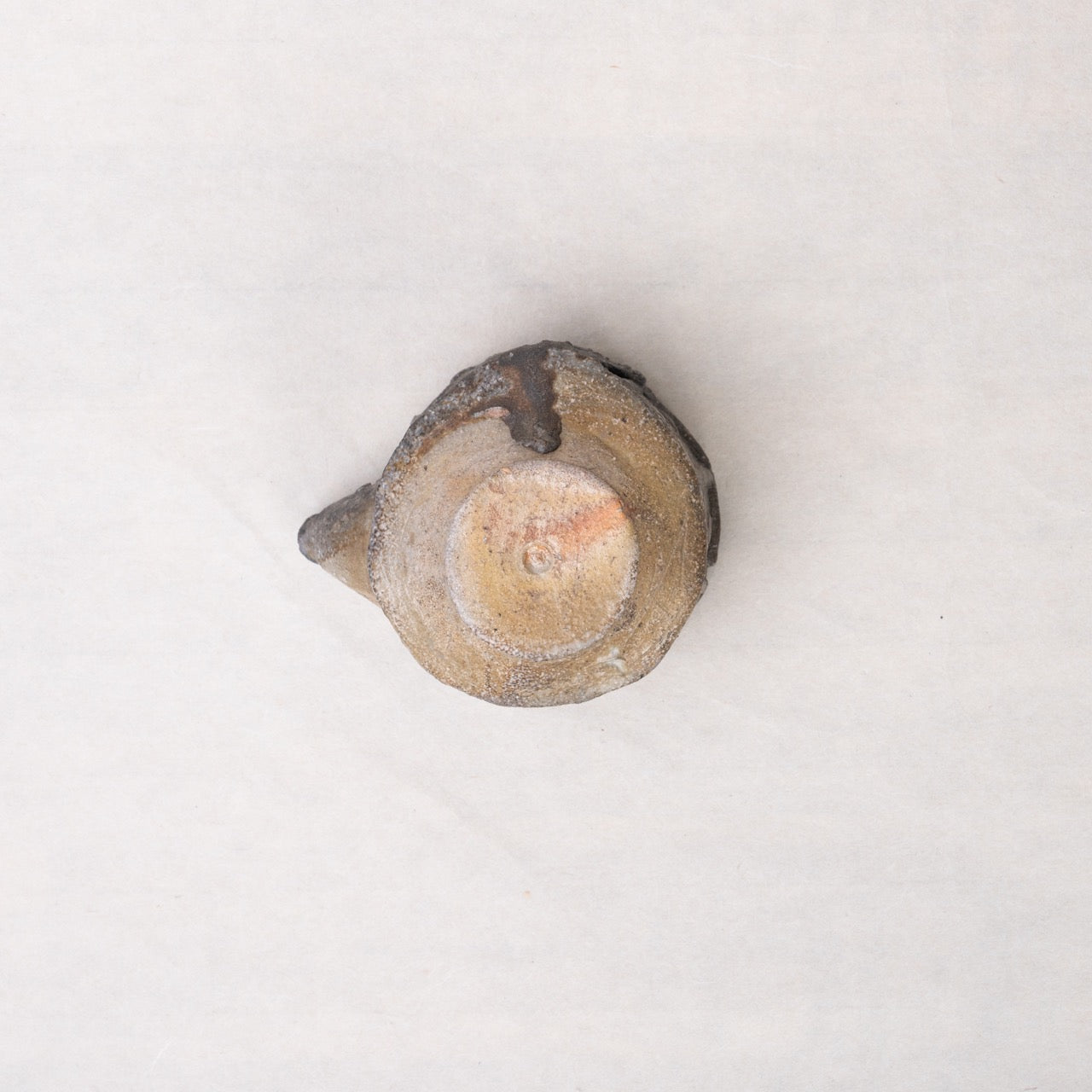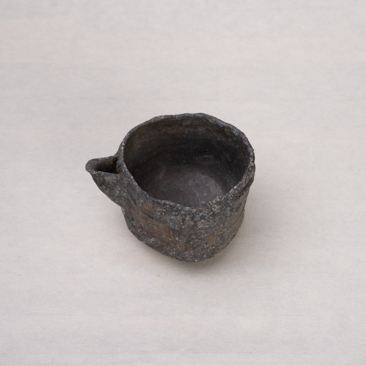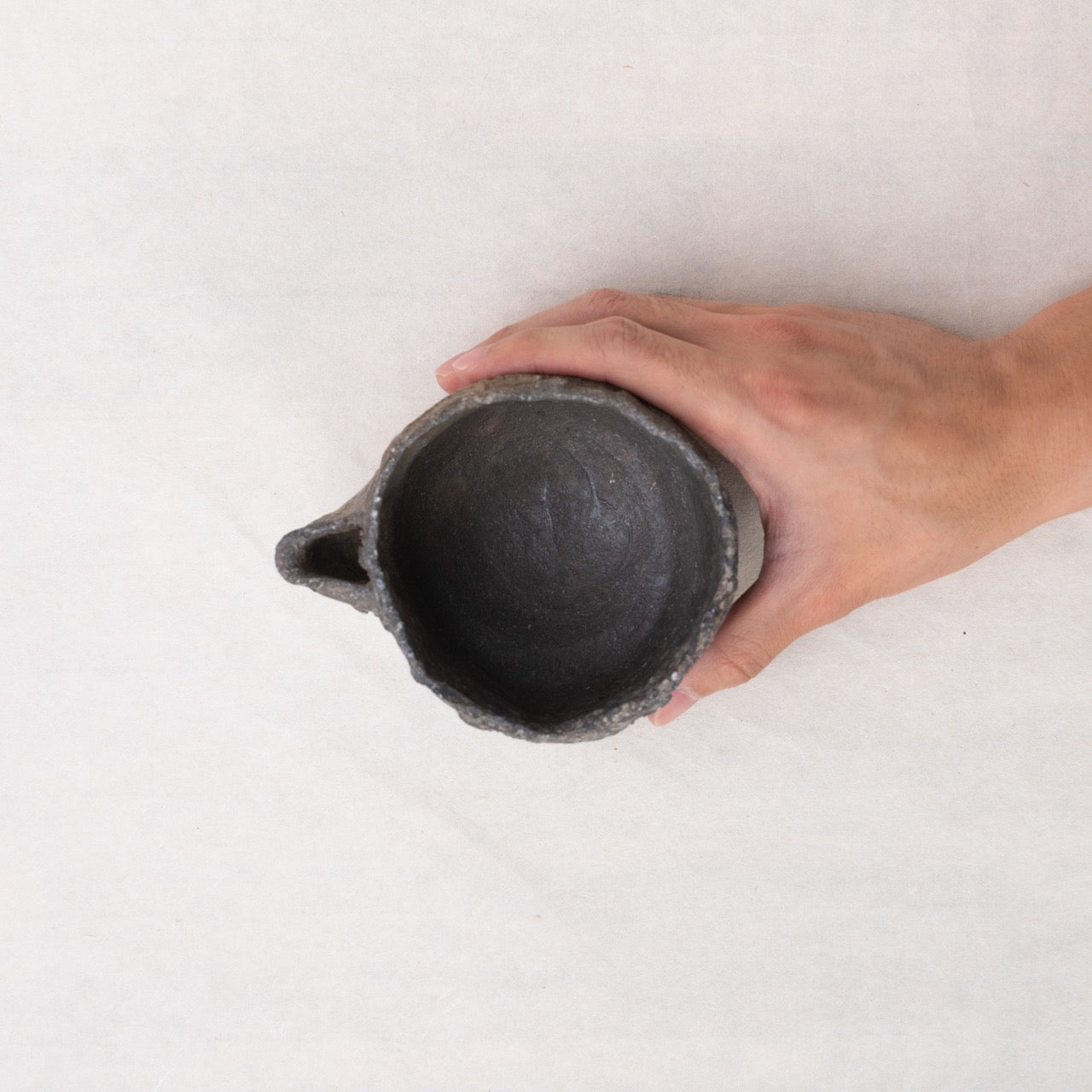 熾に埋もれて炭化焼成となった、渋く切れが良い片口 伊賀の武骨な柄温かみのある陶の質感と福島真弥さんならではのデザインは料理を美しく引き立ててくれます
