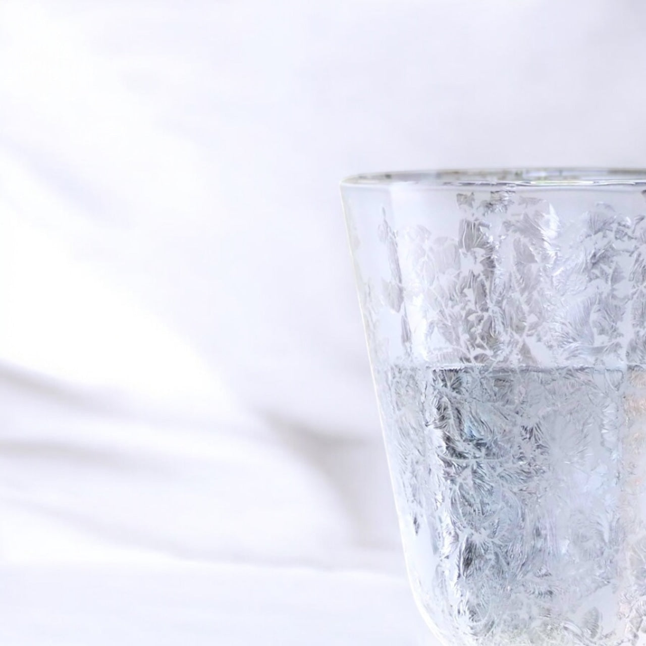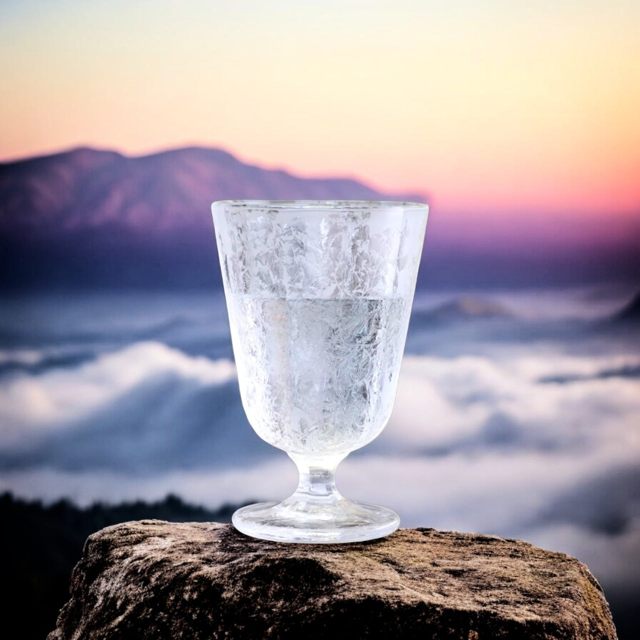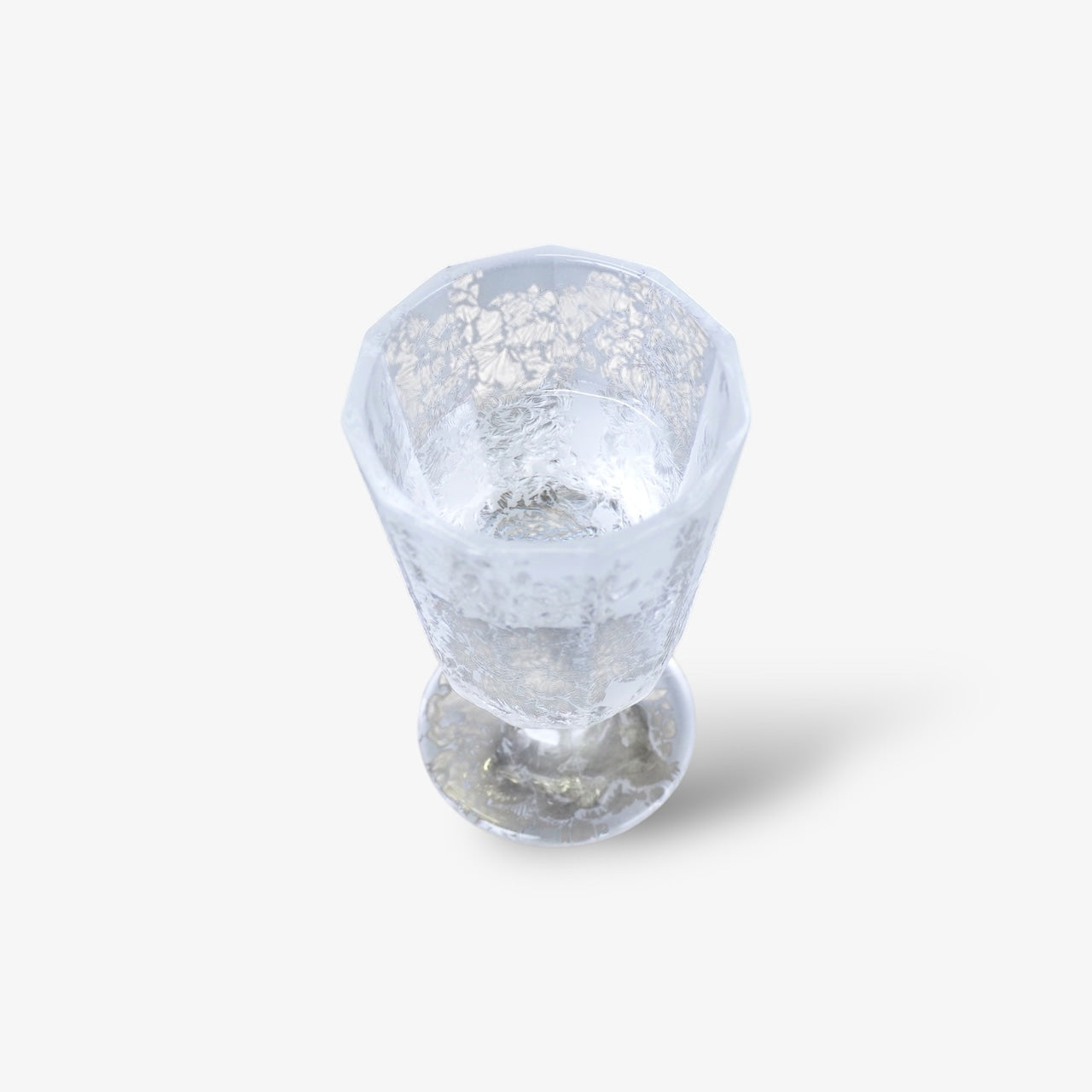高座のある持ちやすいデザインが特徴のアニバーサリーグラス。180mlの適度な容量は、味わい深く、さまざまな飲み物を楽しむのに最適です。結霜の繊細な模様が施されており、光が当たると美しく揺らめき、まるで特別な瞬間を演出してくれます。めでたい兆しを感じるハレの日の祝杯に、ぜひご使用いただきたい一品です。