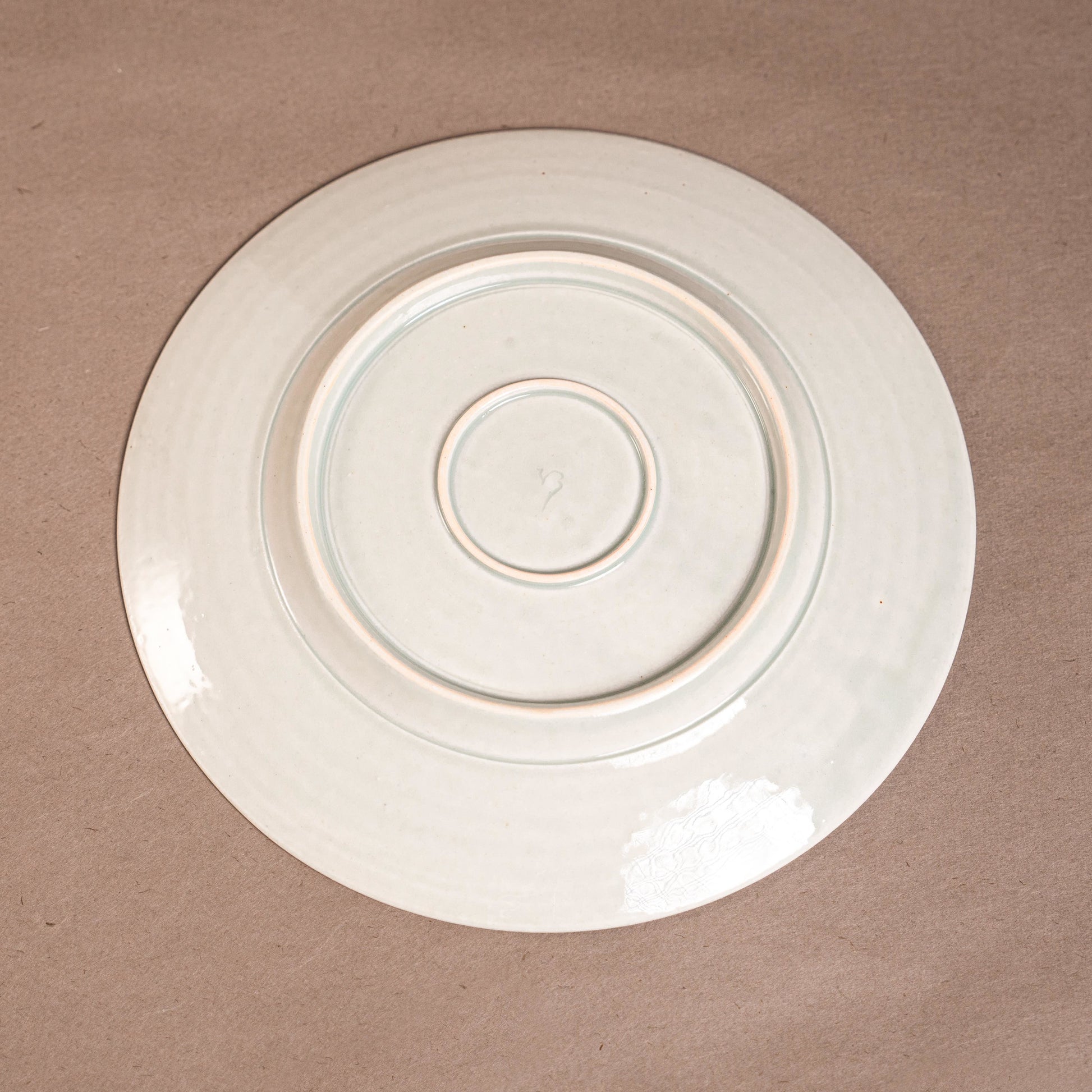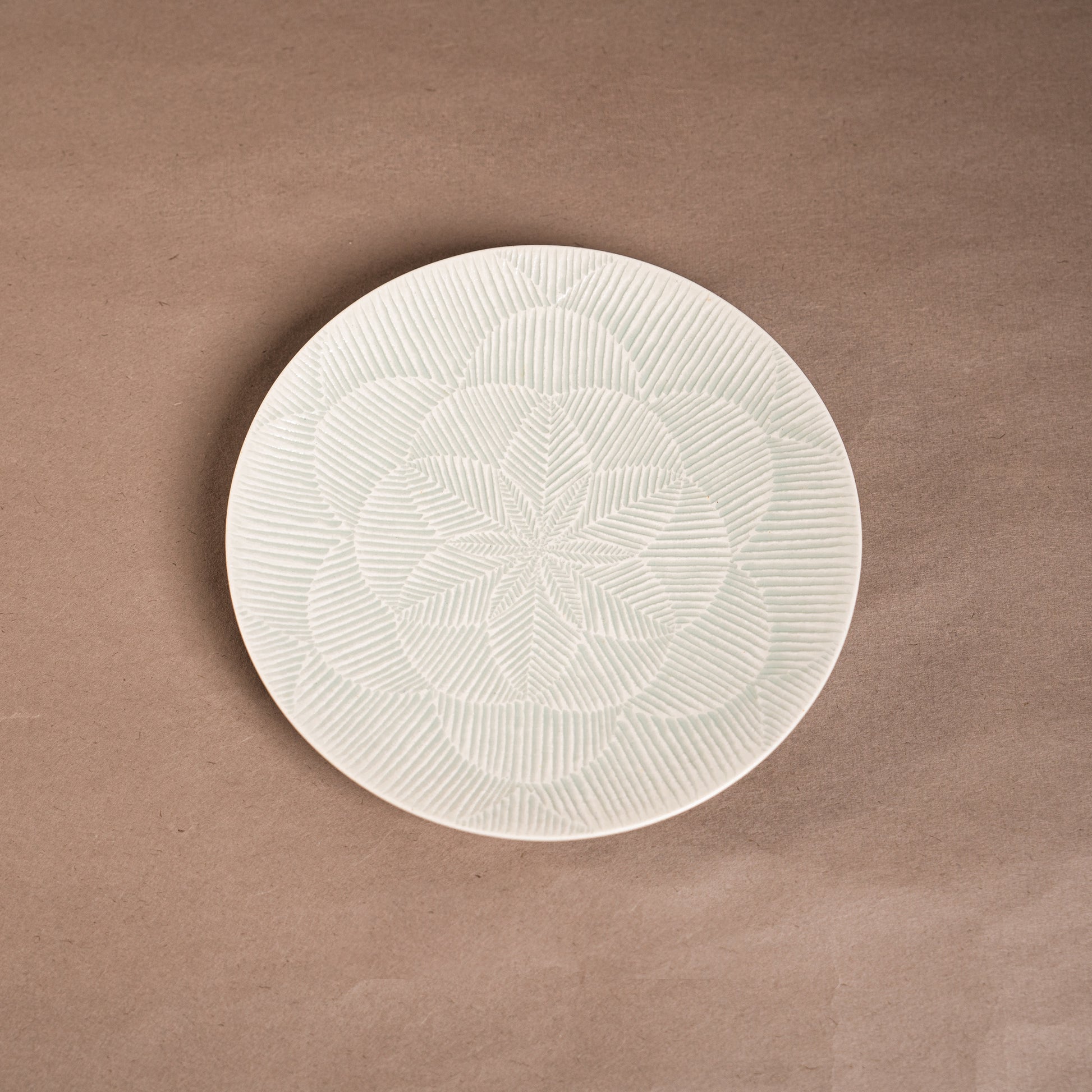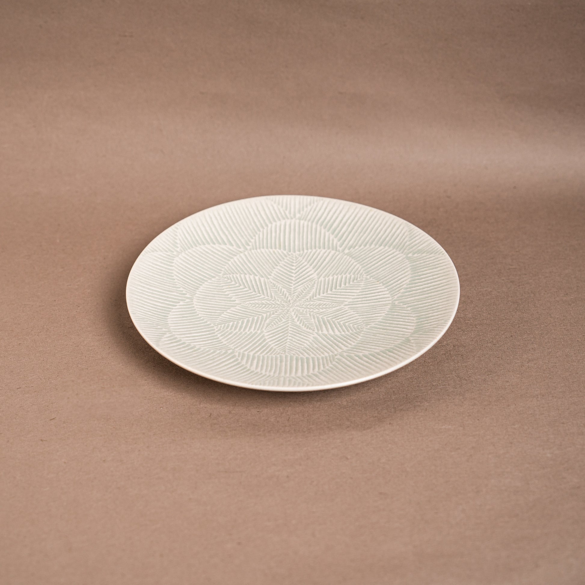 白い土色に、一本ずつ手彫りした青い文様が特徴の、青白磁の特別なお皿です。 上品な艶感で食卓に馴染み、和洋問わず料理を引き立てます。 メインのお皿におすすめです。