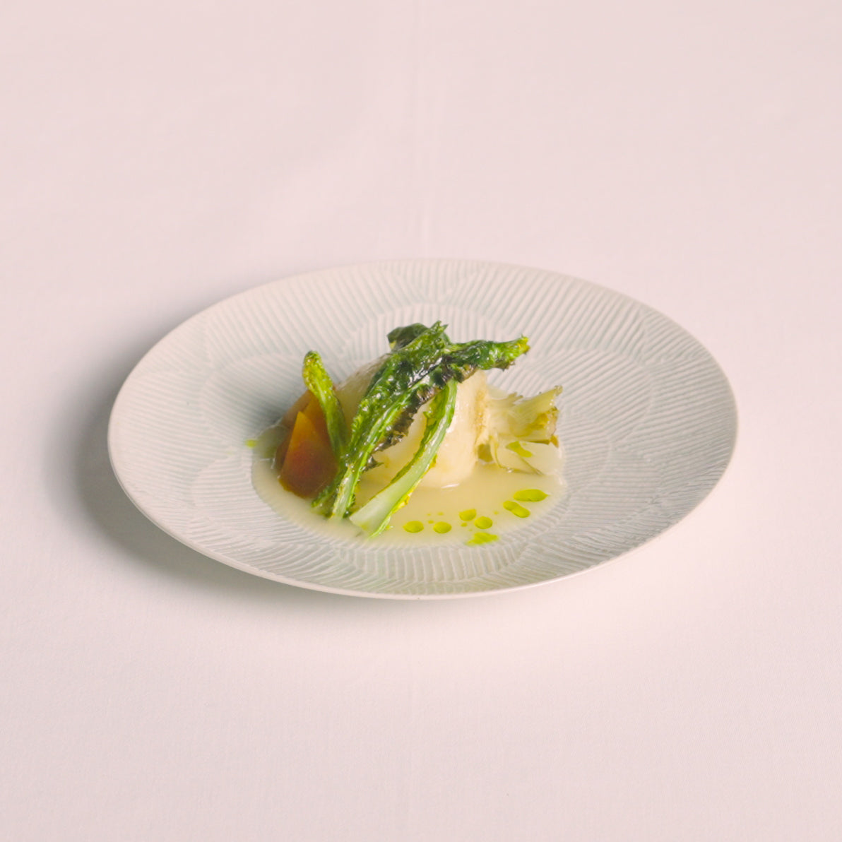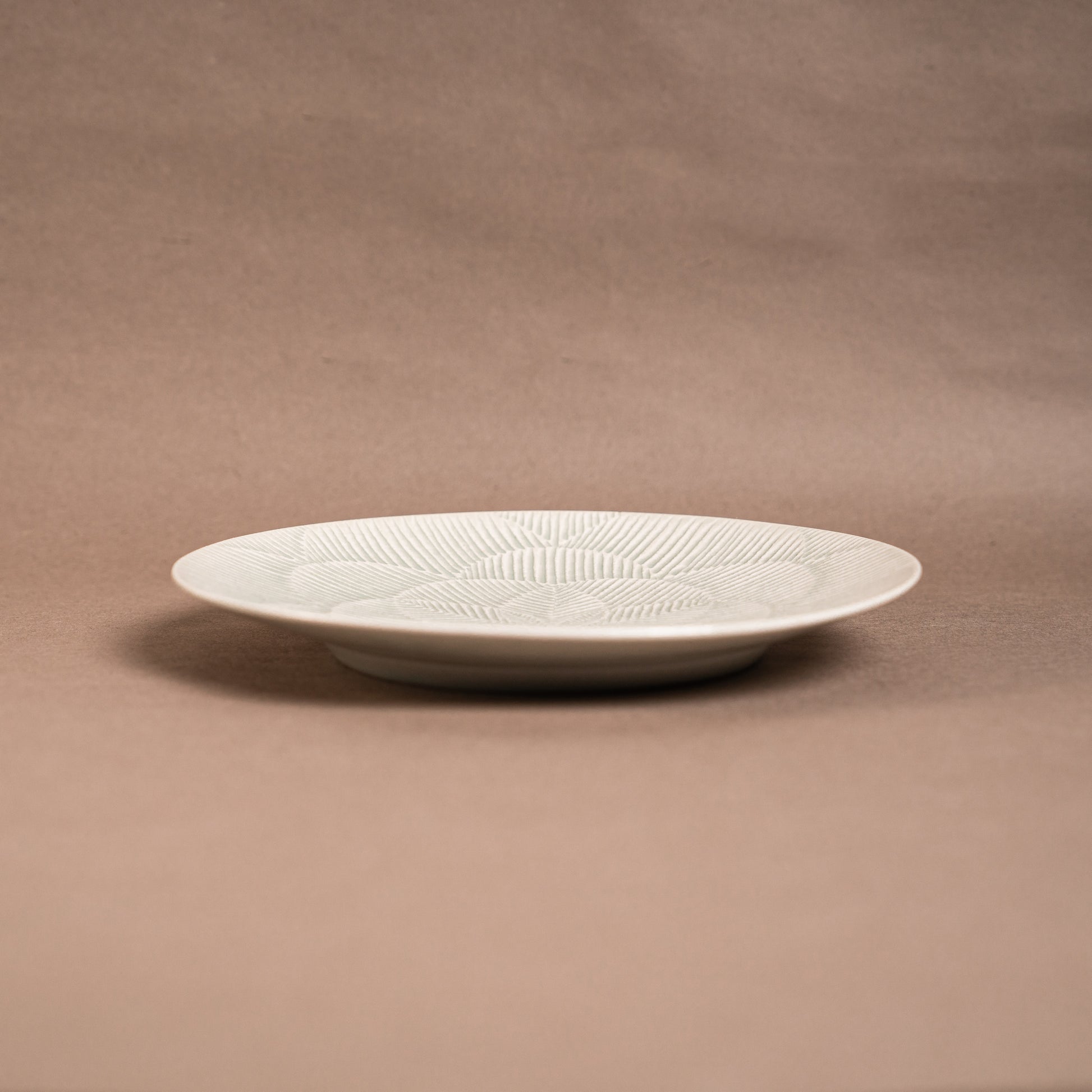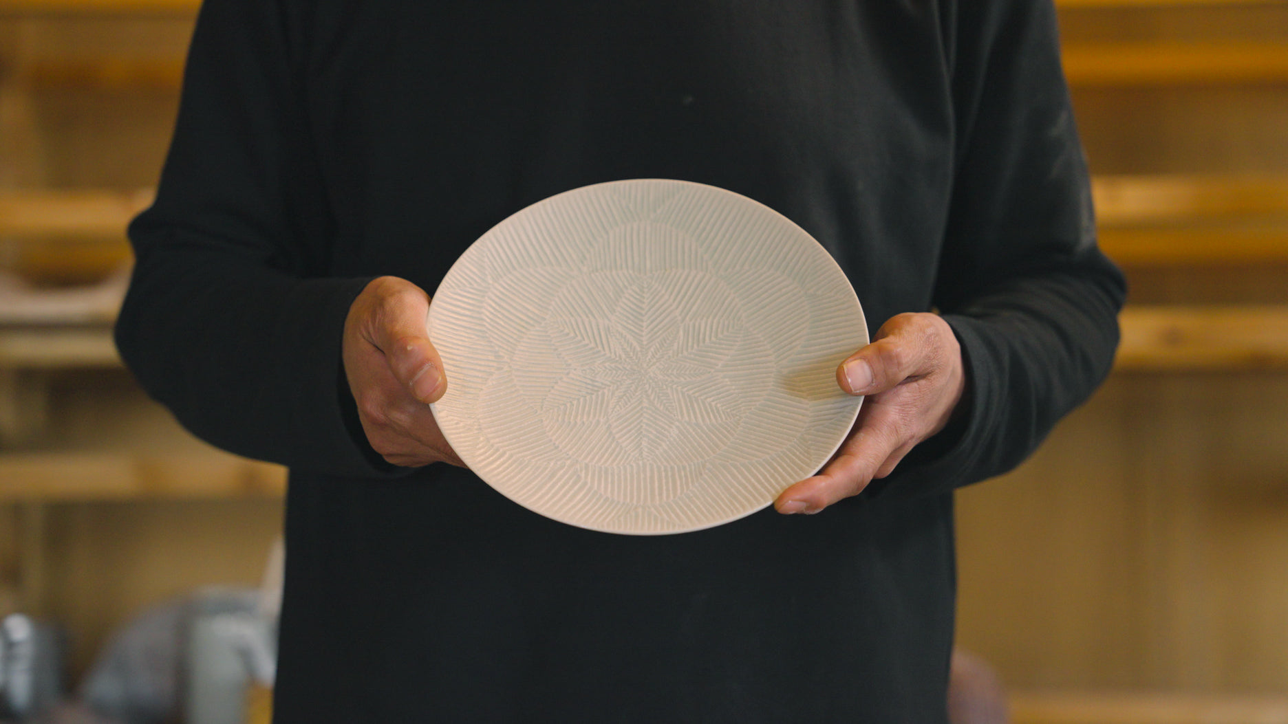白い土色に、一本ずつ手彫りした青い文様が特徴の、青白磁の特別なお皿です。 上品な艶感で食卓に馴染み、和洋問わず料理を引き立てます。 メインのお皿におすすめです。