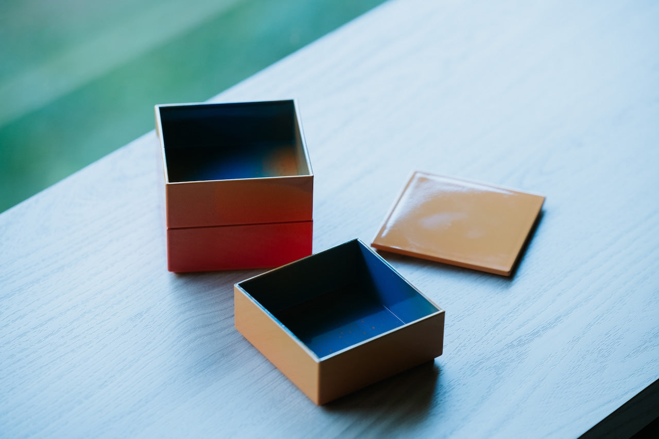 石川県加賀市の加佐の岬から見る夏の終わりの夕焼けが反射して海の色と混ざり合ったデザイン。外側は橙のグラデーション、内側は海に差し込む光の変わり塗となっています。