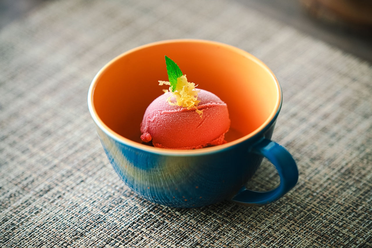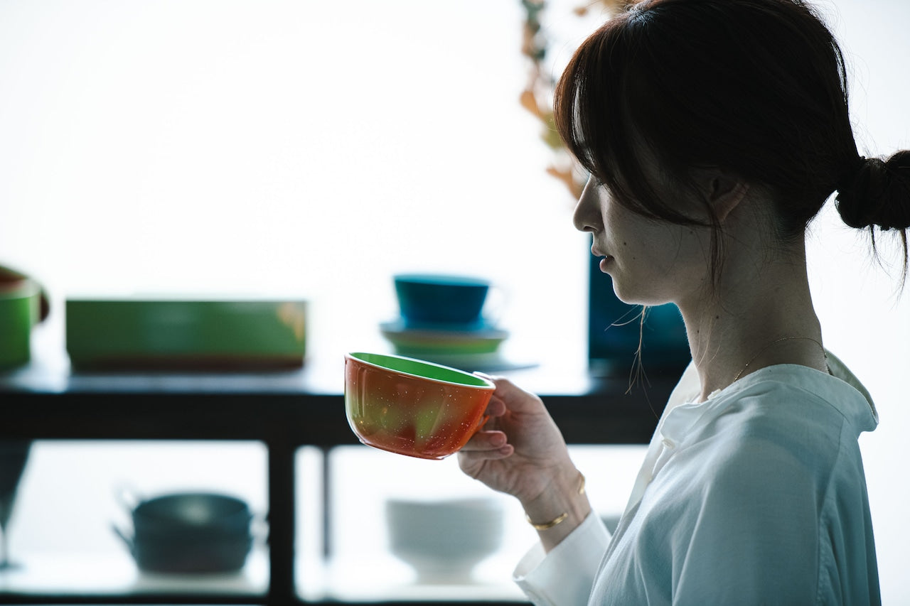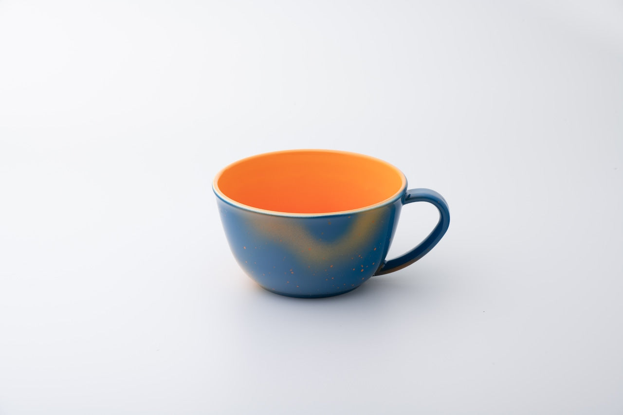 石川県加賀市の景勝地である加佐の岬から見る海岸の夕陽がモチーフとなった幻想的なデザイン。内側は夕陽の橙グラデーション、外側は青や橙の色彩や斑点の変わり塗で、侘び寂びを感じる手付きのカップ。吹き付け塗装で職人が一つ一つ手作業で塗重ねられ、食洗機や電子レンジにも対応。