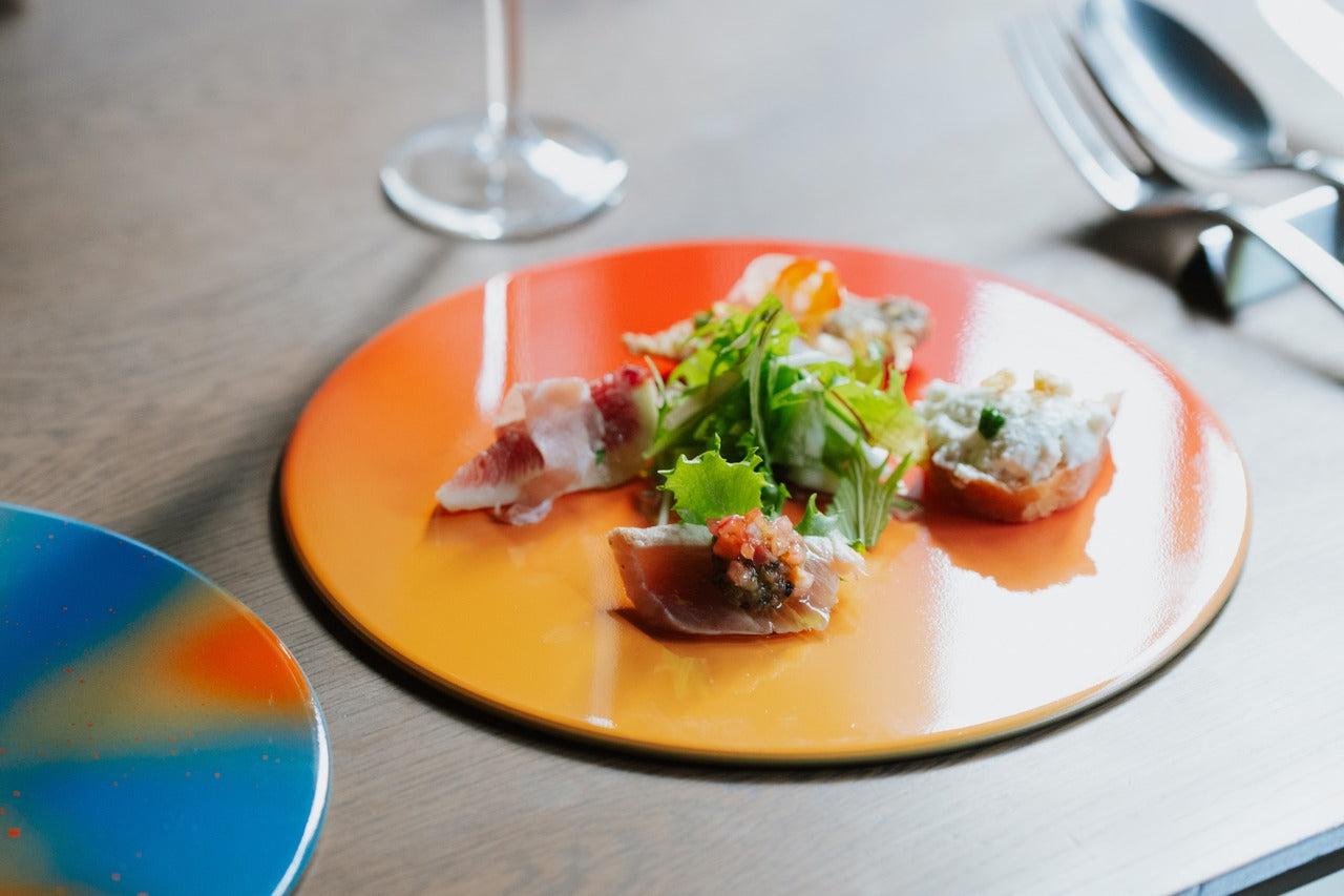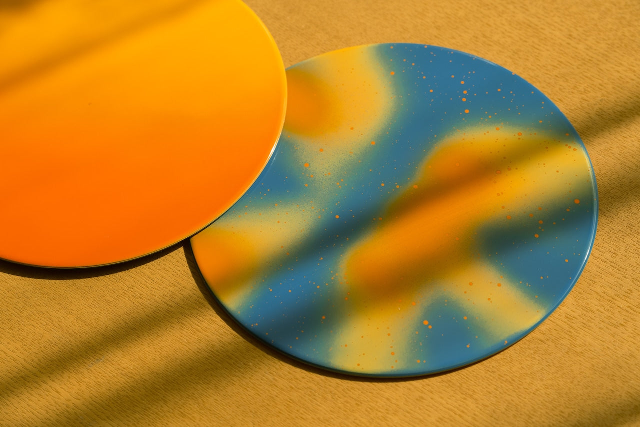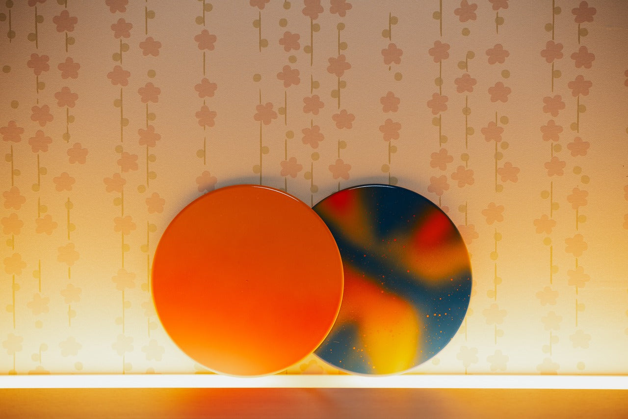 石川県加賀市の加佐の岬から見る夏の終わりの夕焼けが反射して海の色と混ざり合ったデザイン。橙のグラデーションと海に差し込む光の変わり塗の両面塗装となっています。お好みに合わせたカラーてお使い分けてみてはいかがでしょう