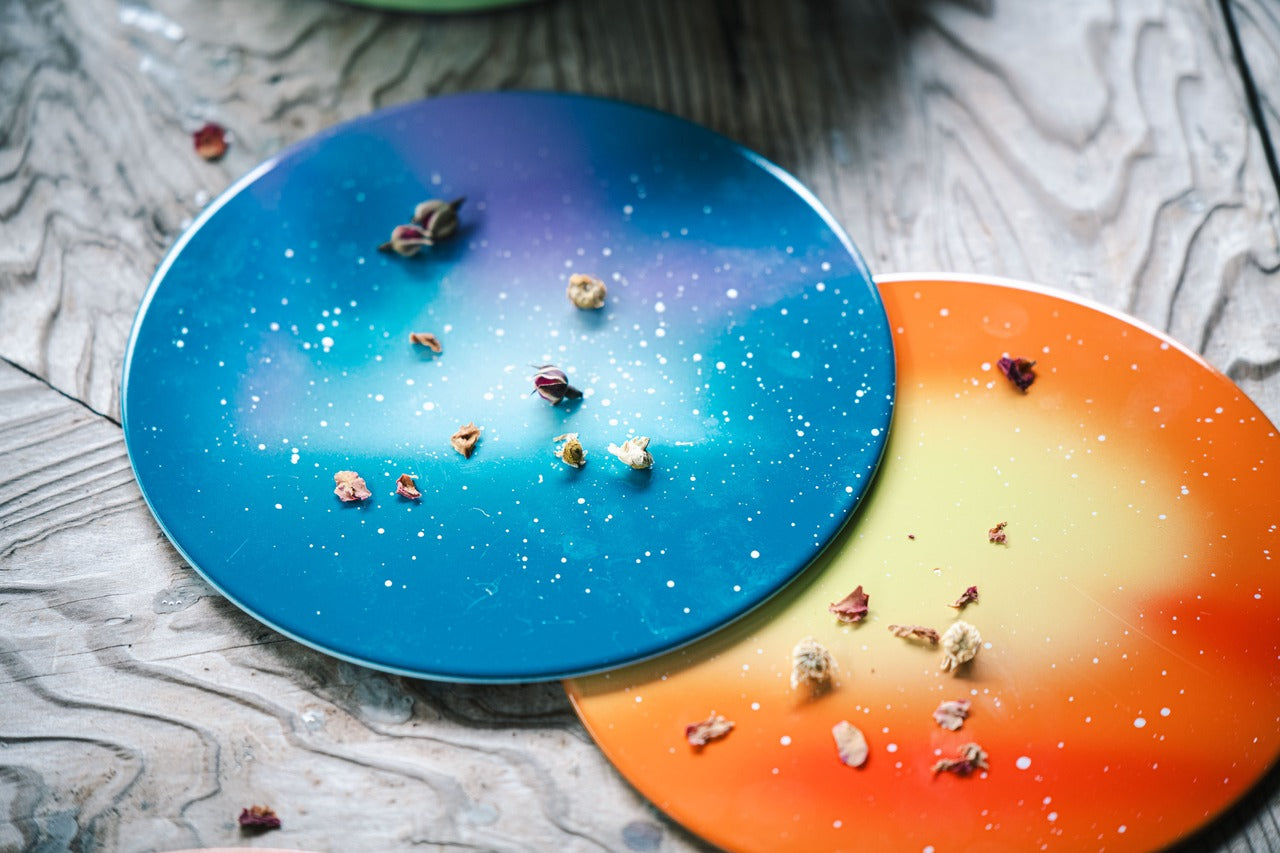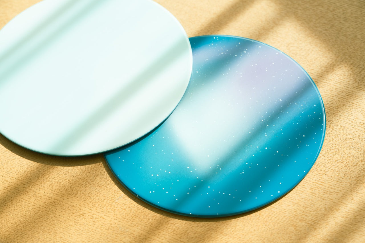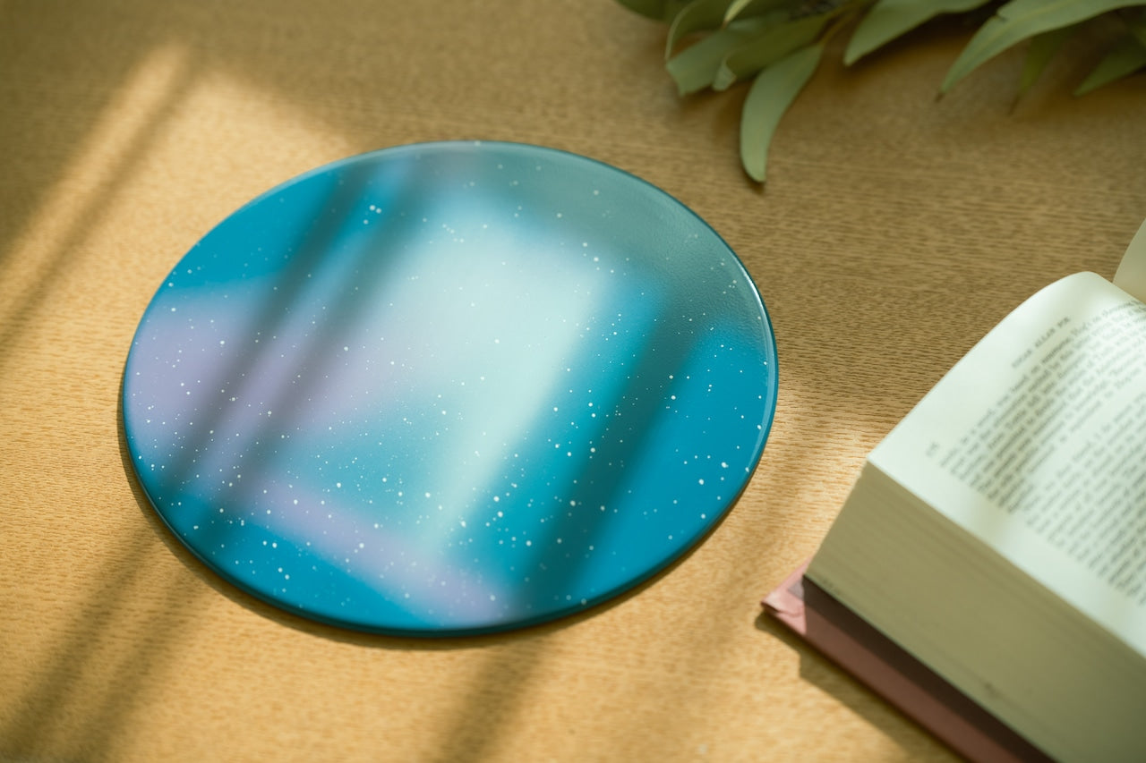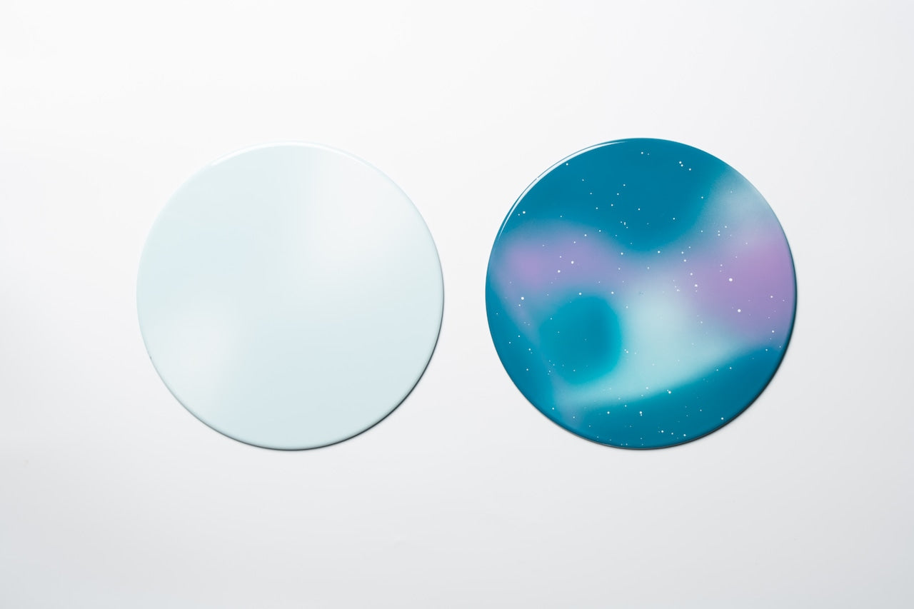 白と青のグラデーションと川に光が差し込み雪が舞っているような変わり塗の両面塗装です。お好みにあったカラーでお使いわけてみてはどうでしょう。