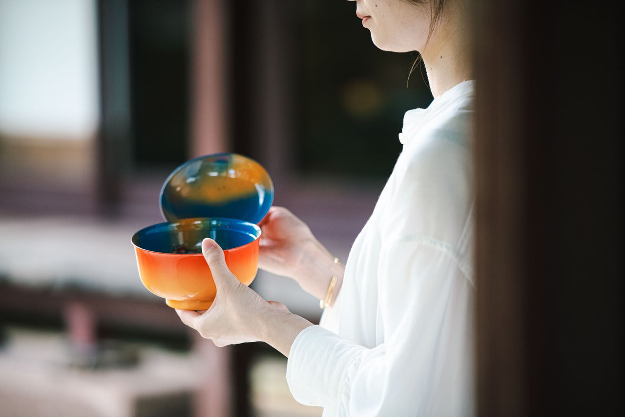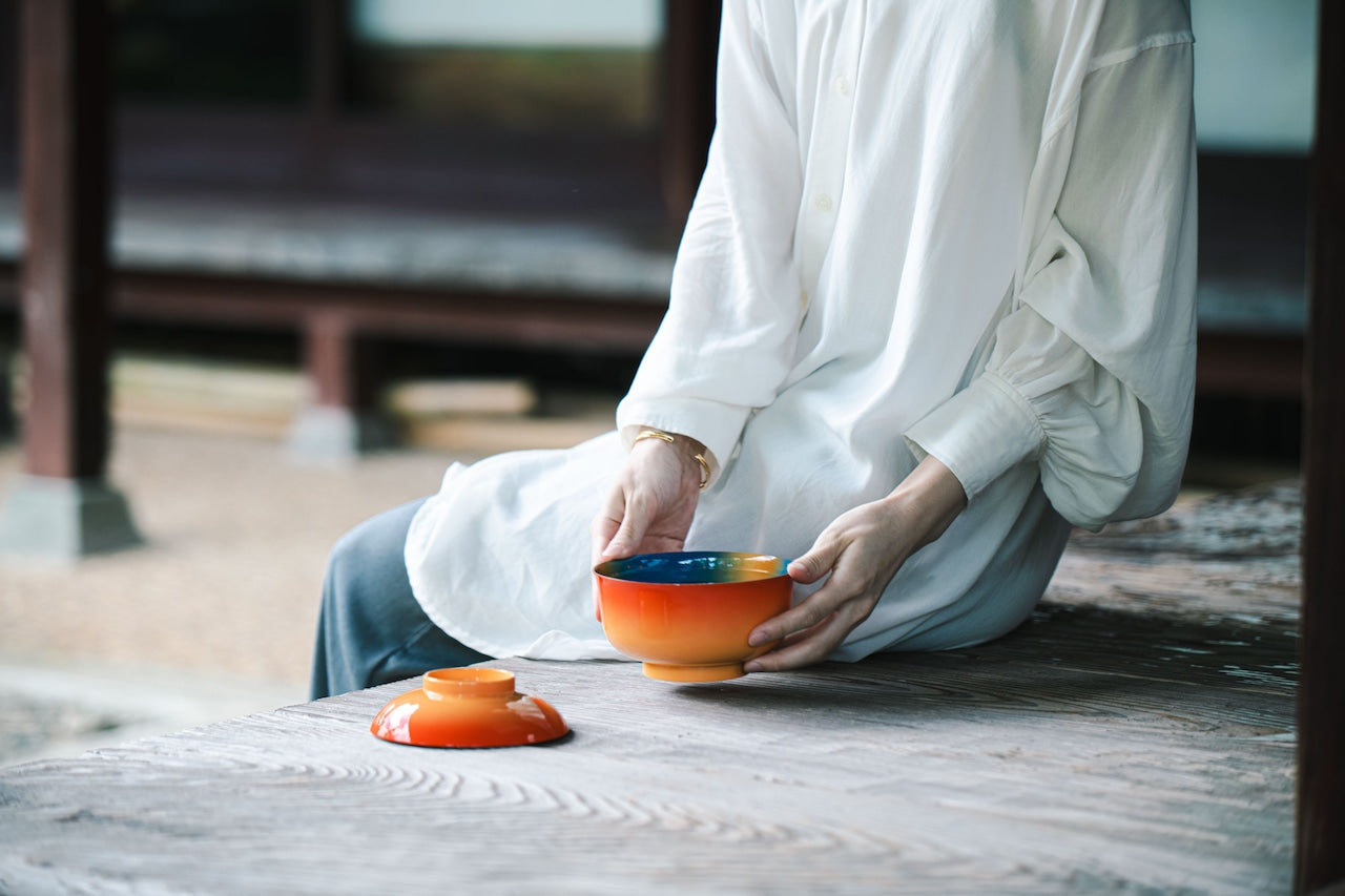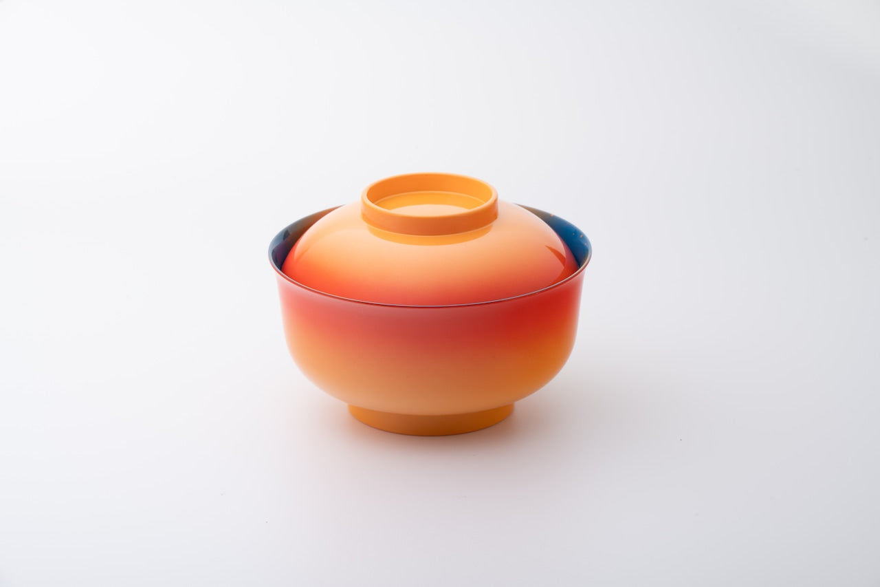 石川県加賀市海岸・加佐の岬から見た夕焼けが海岸線に混ざり合った幻想的な情景をモチーフにしたデザイン。内外で対照的な色彩で侘び寂びを表現した大きめの椀で、豚汁、麺類、お雑煮、アイスクリームなど様々な使い方ができます。電子レンジ対応(-20℃~140℃)、使った後は食洗器へ、クリアー塗装による抗菌効果のあるトップコートで仕上げた蓋付椀。専用化粧箱入り。
