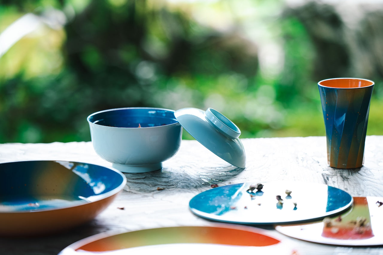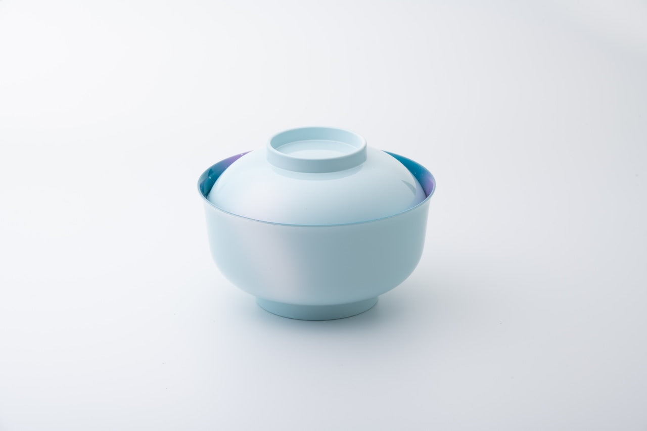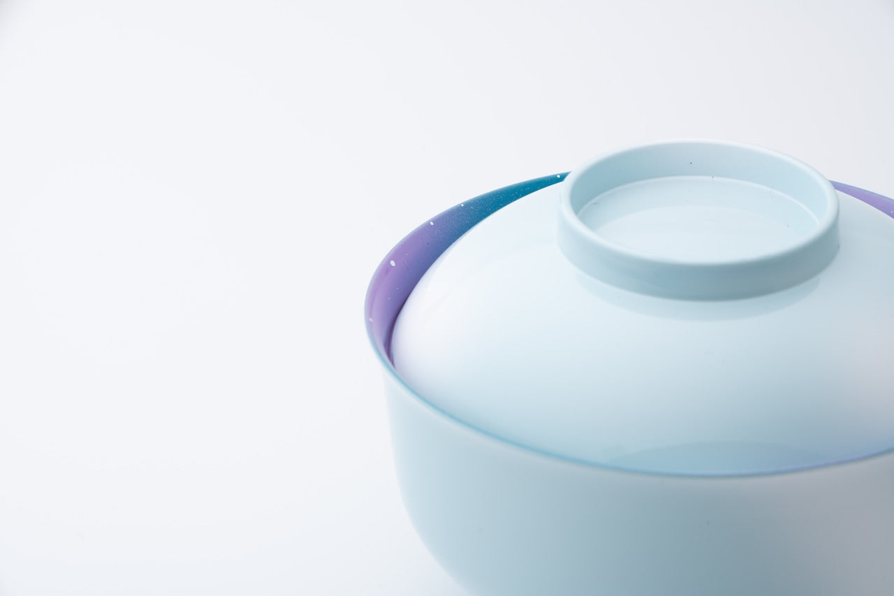 石川県加賀市山中温泉の渓谷から見た木々に積もった雪に明かりが差し込んだ雪景色をモチーフにしたデザイン。内で対照的な色彩は、吹き付け塗装職人の手作業で塗重ねた大きめの椀。お雑煮、麺類、アイスクリームなどのデザートにも使ってもよい色合いです。電子レンジ対応(-20℃~140℃)、使った後は食洗器へ、クリアー塗装による抗菌効果のあるトップコートで仕上げた蓋付椀です。専用化粧箱入り。