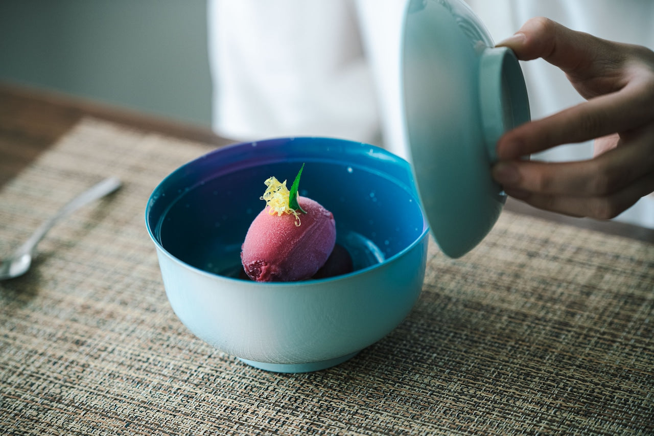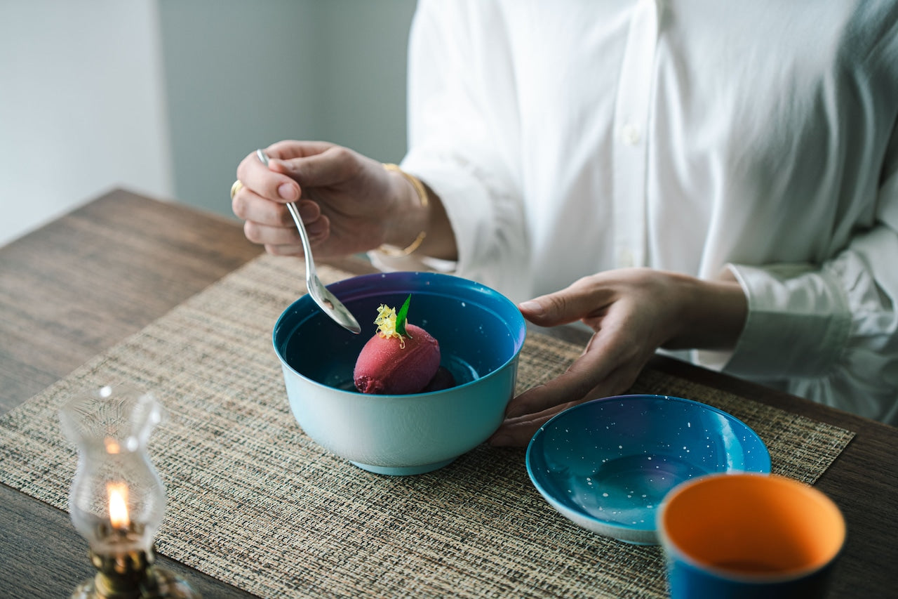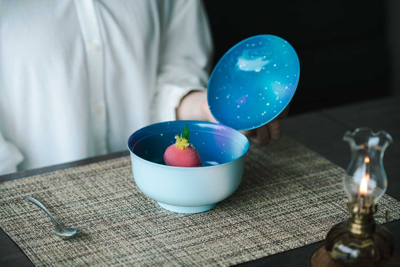 石川県加賀市山中温泉の渓谷から見た木々に積もった雪に明かりが差し込んだ雪景色をモチーフにしたデザイン。内で対照的な色彩は、吹き付け塗装職人の手作業で塗重ねた大きめの椀。お雑煮、麺類、アイスクリームなどのデザートにも使ってもよい色合いです。電子レンジ対応(-20℃~140℃)、使った後は食洗器へ、クリアー塗装による抗菌効果のあるトップコートで仕上げた蓋付椀です。専用化粧箱入り。